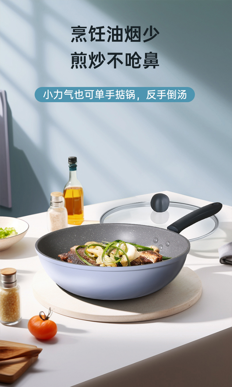 1、烹饪油烟少,煎炒不呛鼻,小力气也可单手掂锅,反手倒汤