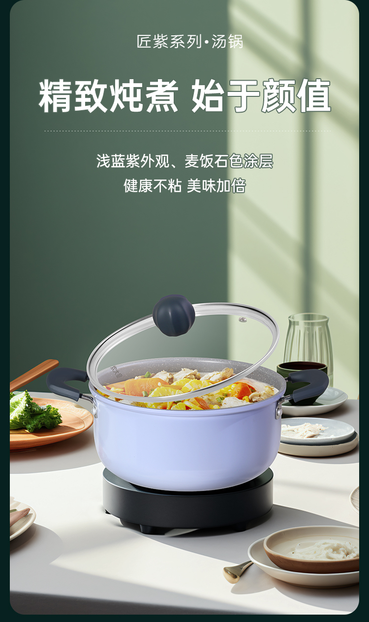 1、精致炖煮 始于颜值,浅蓝紫外观、麦饭石色涂层,健康不粘 美味加倍,一口锅可炖下一只鸡,全家享,实用好锅。