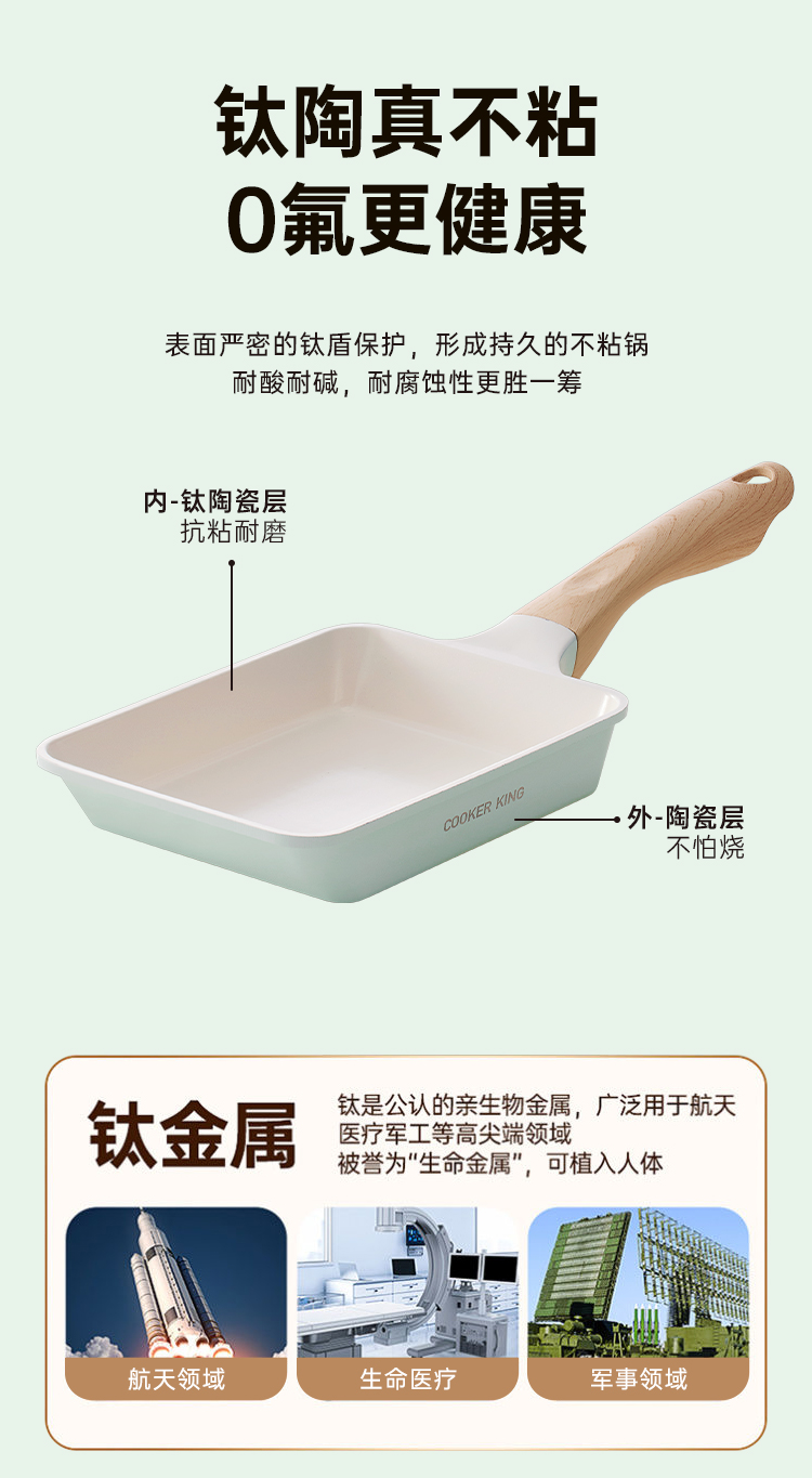 3、钛陶瓷不粘锅0氟更健康,煎鱼不破皮煎蛋好成型,不含氟吃的更健康小火烹饪,慢享生活。