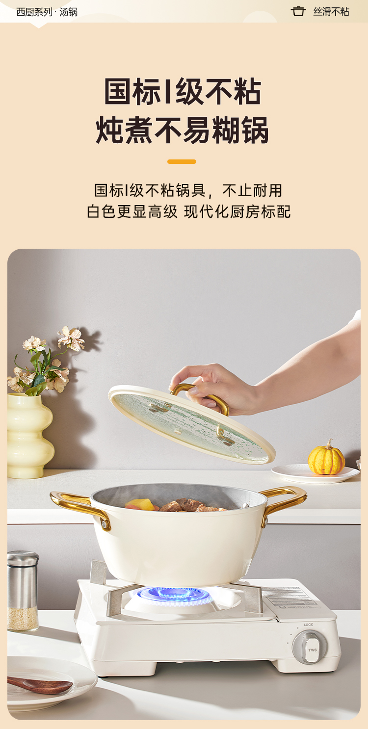 1、国标I级不粘锅具,不止耐用白色更显高级 现代化厨房标配,健康不粘涂层,煎饼煎蛋轻松拿捏轻松下厨,省时省心。