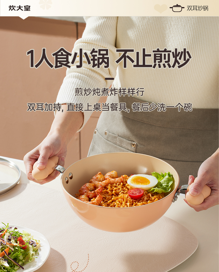 2、1人食小锅,煎炒炖煮炸样样行双耳加持,直接上桌当餐具,餐后少洗一个碗。