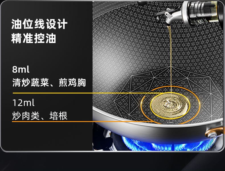 1、加深蜂窝纹防粘实力派,锅内蜂窝全新纹理开放性,全射频浮刻技术,油路通畅更省油。