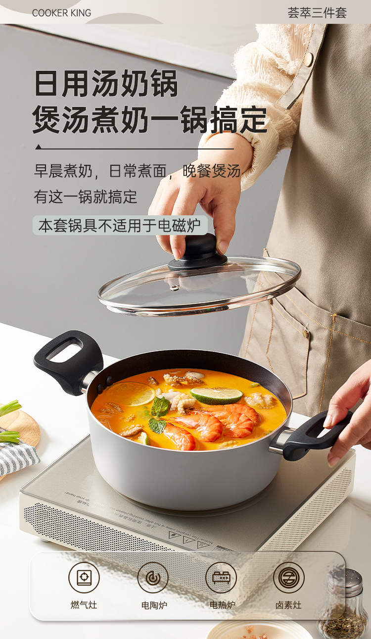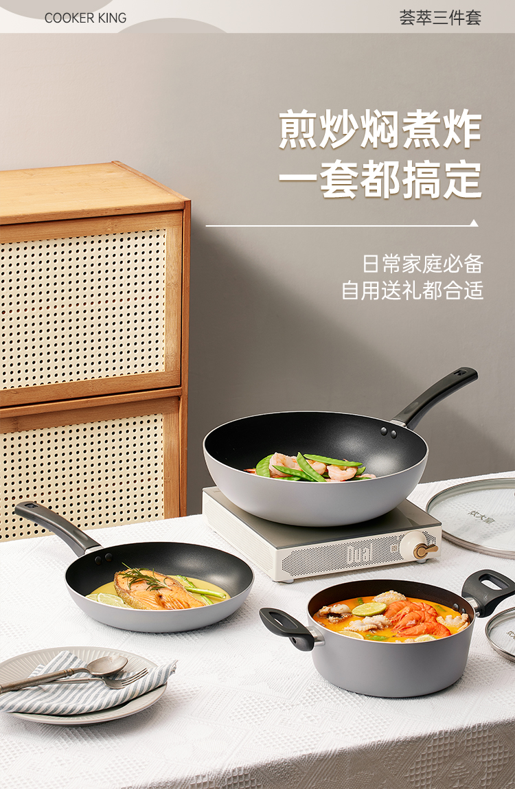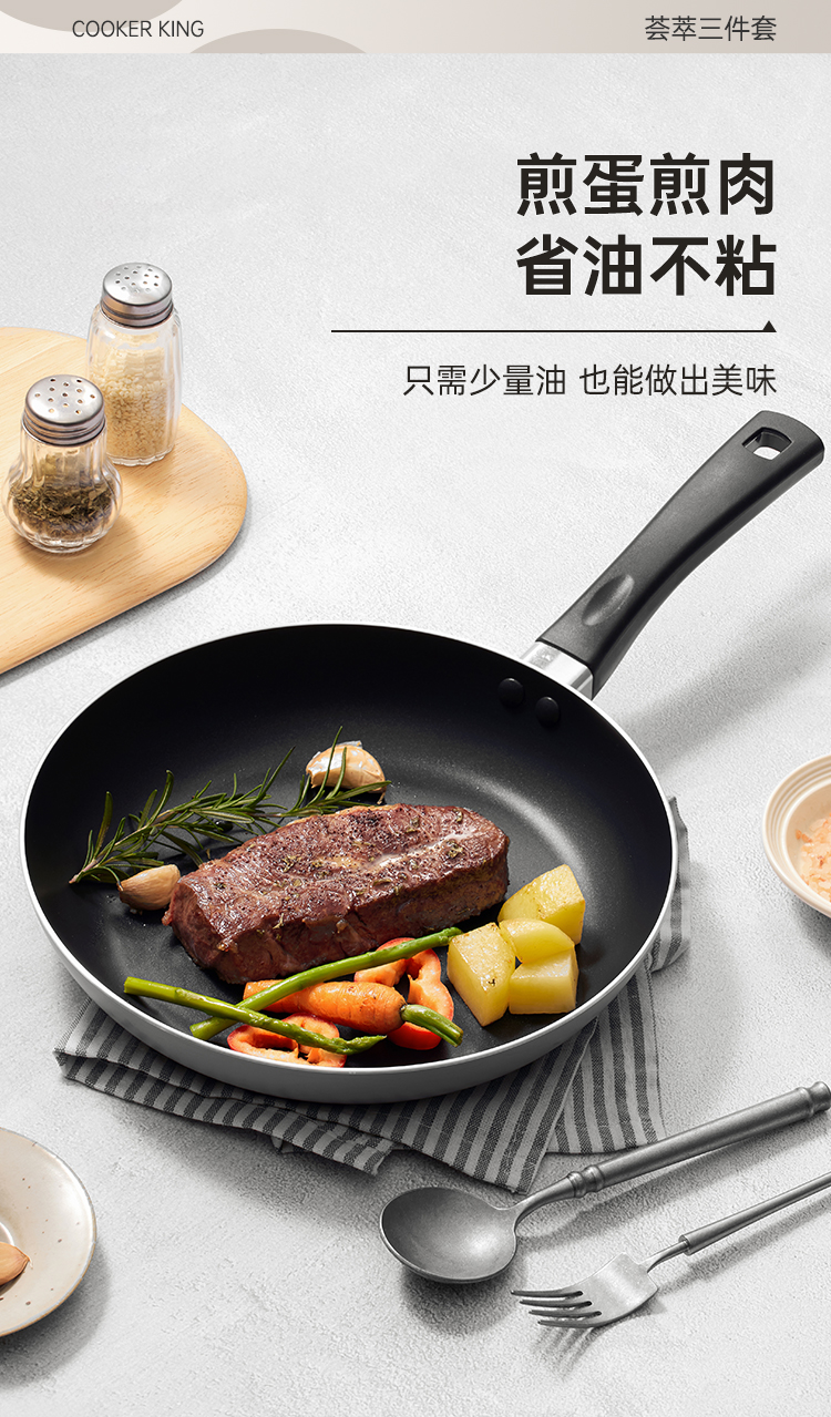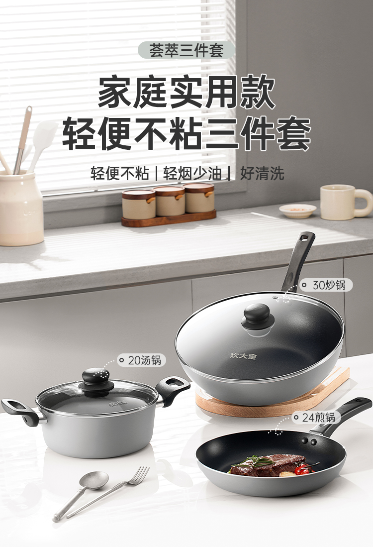 1、家庭实用款轻便不粘三件套,煎炒焖煮炸一套都搞定。