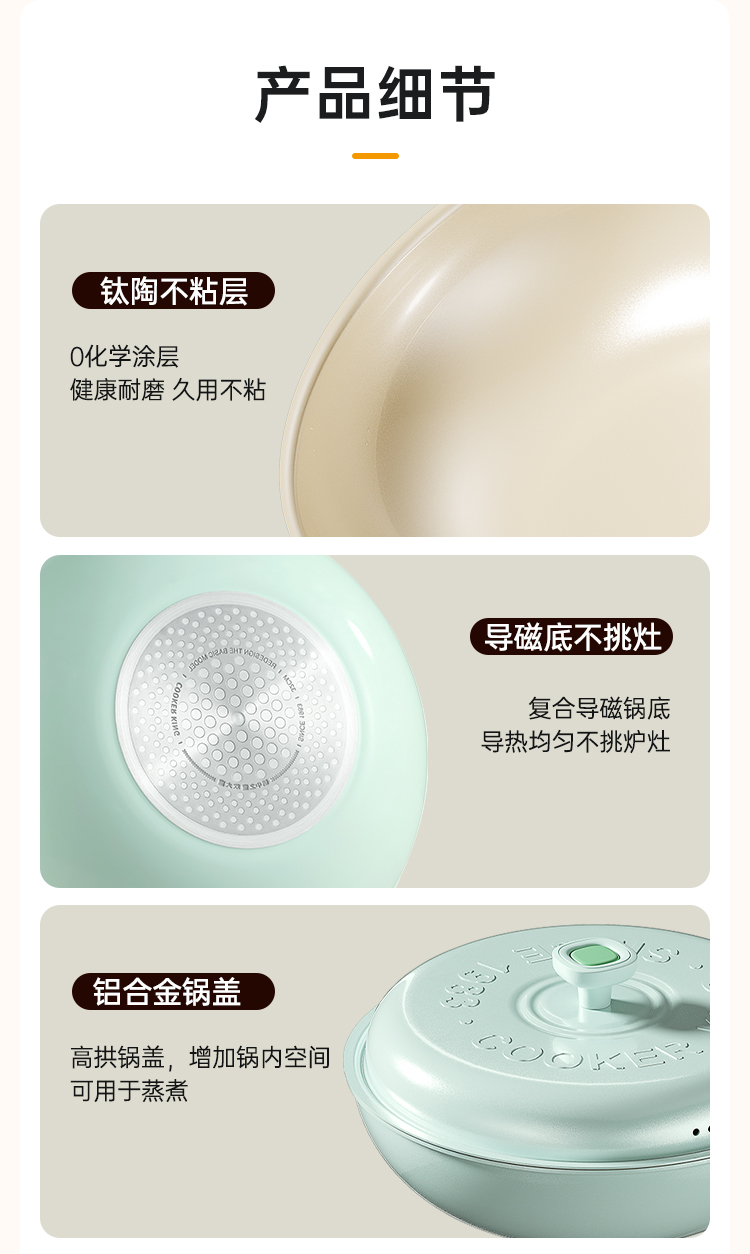 3、钛与瓷的结合是1+1>2的效果抗刮耐磨,持久不粘,更好清洗。