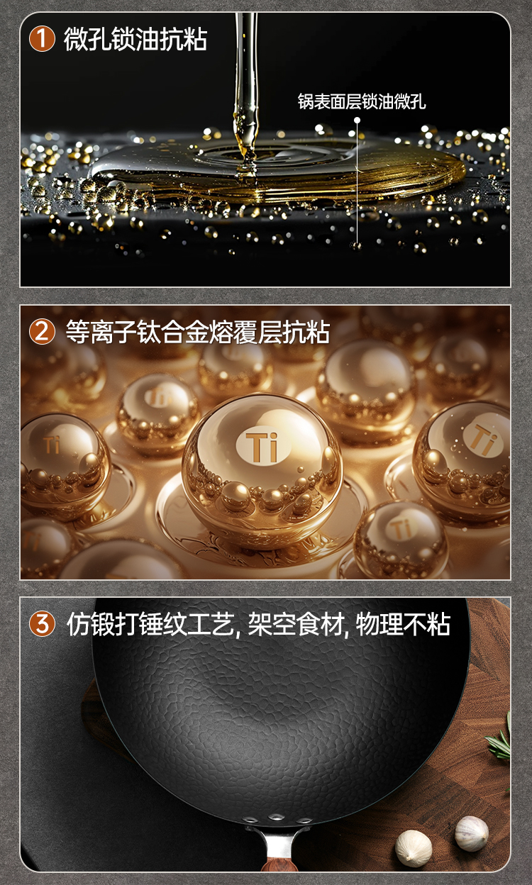 3、等离子钛铁抗粘,科技三重抗粘,烹饪更容易,中式爆炒不二选择