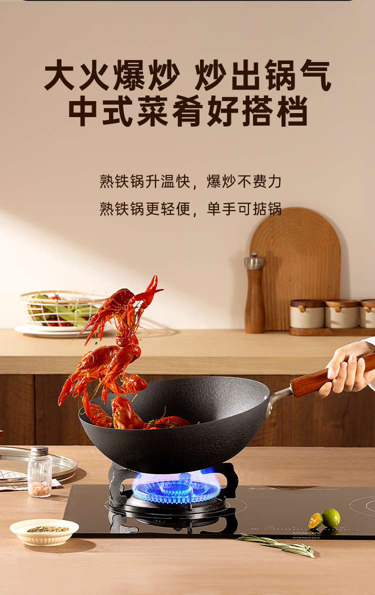 1、严选精铁真正的0涂层铁焱炒锅,疏油纹路,轻便好掂。