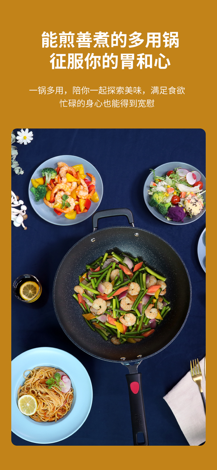 3、健康不粘涂层,不粘锅轻松烹饪,小白下厨so easy,能煎善煮的多用锅