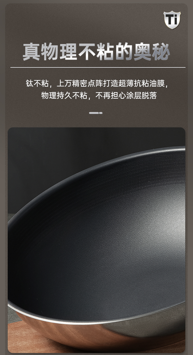 2、钛不粘,无涂层,上万精密点阵打造超薄抗粘油膜物理持久不粘,不再担心涂层脱落。