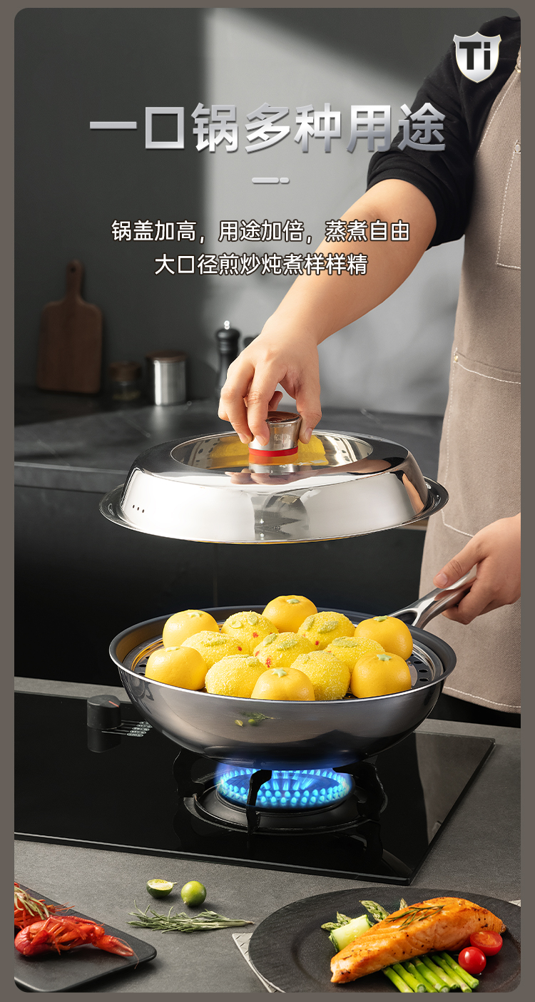 3、钛锅坚硬材质稳定,耐酸性好烹饪酸性食材不怕腐蚀,使用更长久。