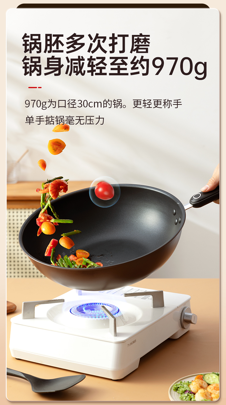 1、锅身升级R角弧度翻炒更丝滑不易洒,锅胚多次打磨锅身减轻至约970g,厚底薄壁,匀热控油,少油烹饪美食轻油美食爱好者的福音。