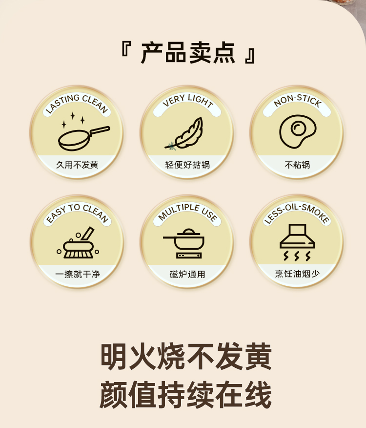 1、健康不粘涂层,纳米喷涂陶瓷外壁耐磨不怕烧久用不发黄,煎饼煎蛋轻松拿捏轻松下厨,省时省心,锅身轻便,掂锅不累下厨做美食,轻松拿捏。