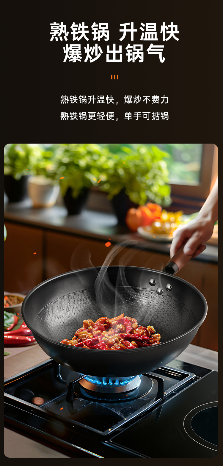 3、精铁锅升温快,爆炒不费力,精铁锅更轻便,单手可掂锅。