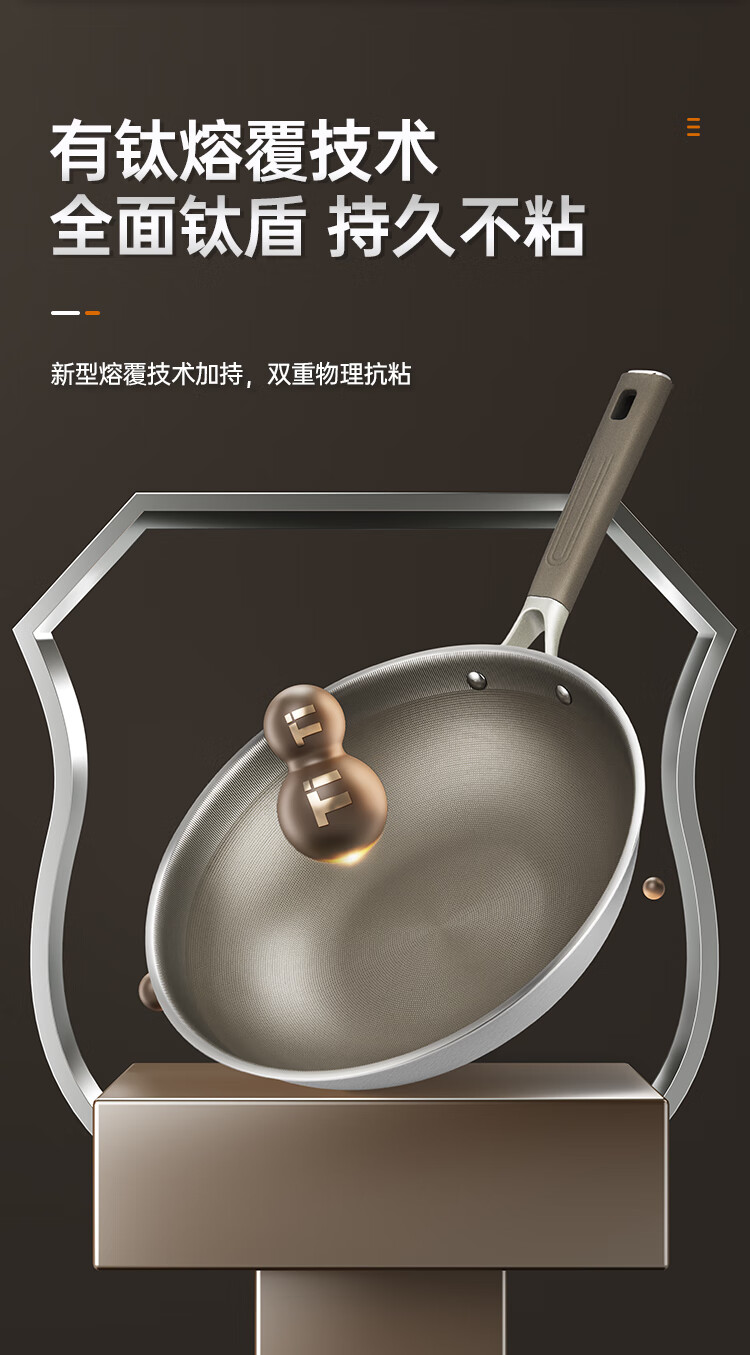 1、纯钛物理不沾无涂层钛金健康不粘锅