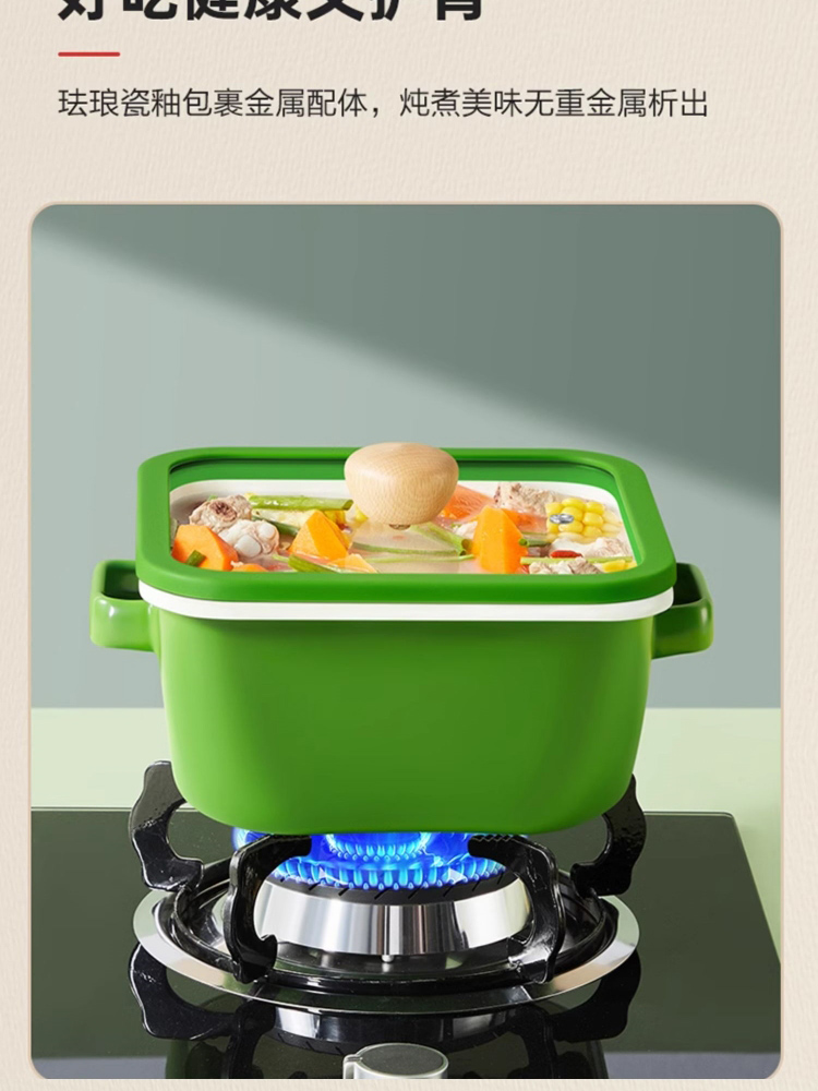 3、多种炉灶均可使用,大小厨房烹饪游刃有余,锅身内外均为搪瓷材质,内刷不伤锅,外刷不掉色,清洗安心无忧。
