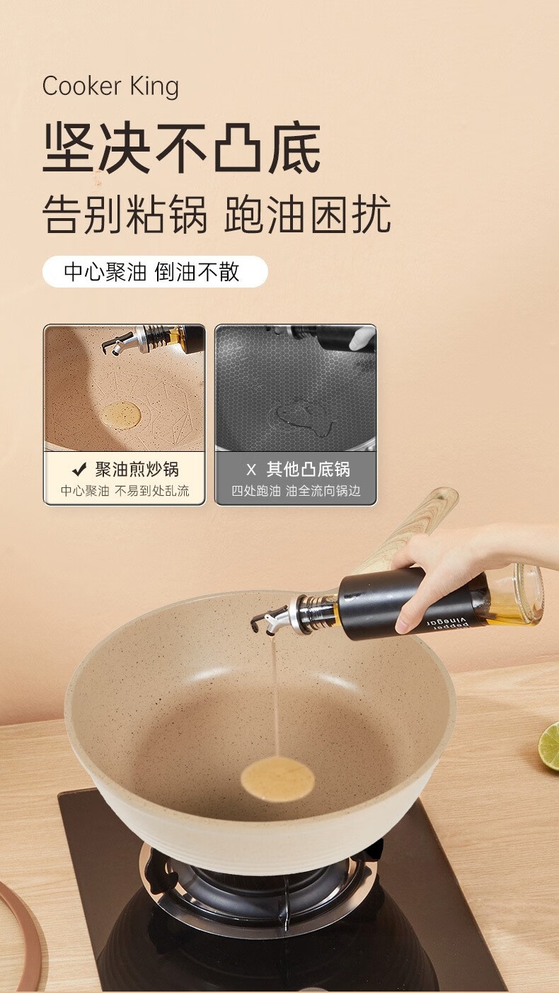 1、坚决不凸底告别粘锅 跑油困扰中心聚油倒油不散。