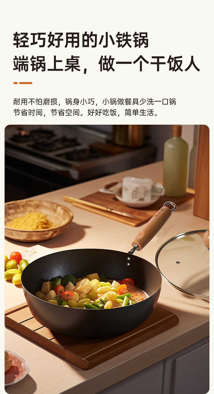 1、煎炒多用锅,不挑食材,不挑锅铲锅壁没有任何涂层,可炒贝壳类带骨头类食材也可用铁铲,钢丝球,下厨没约束。