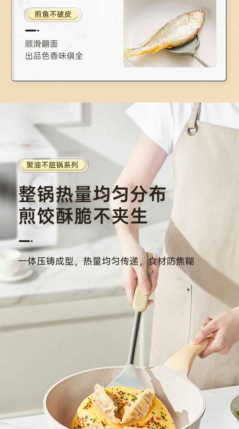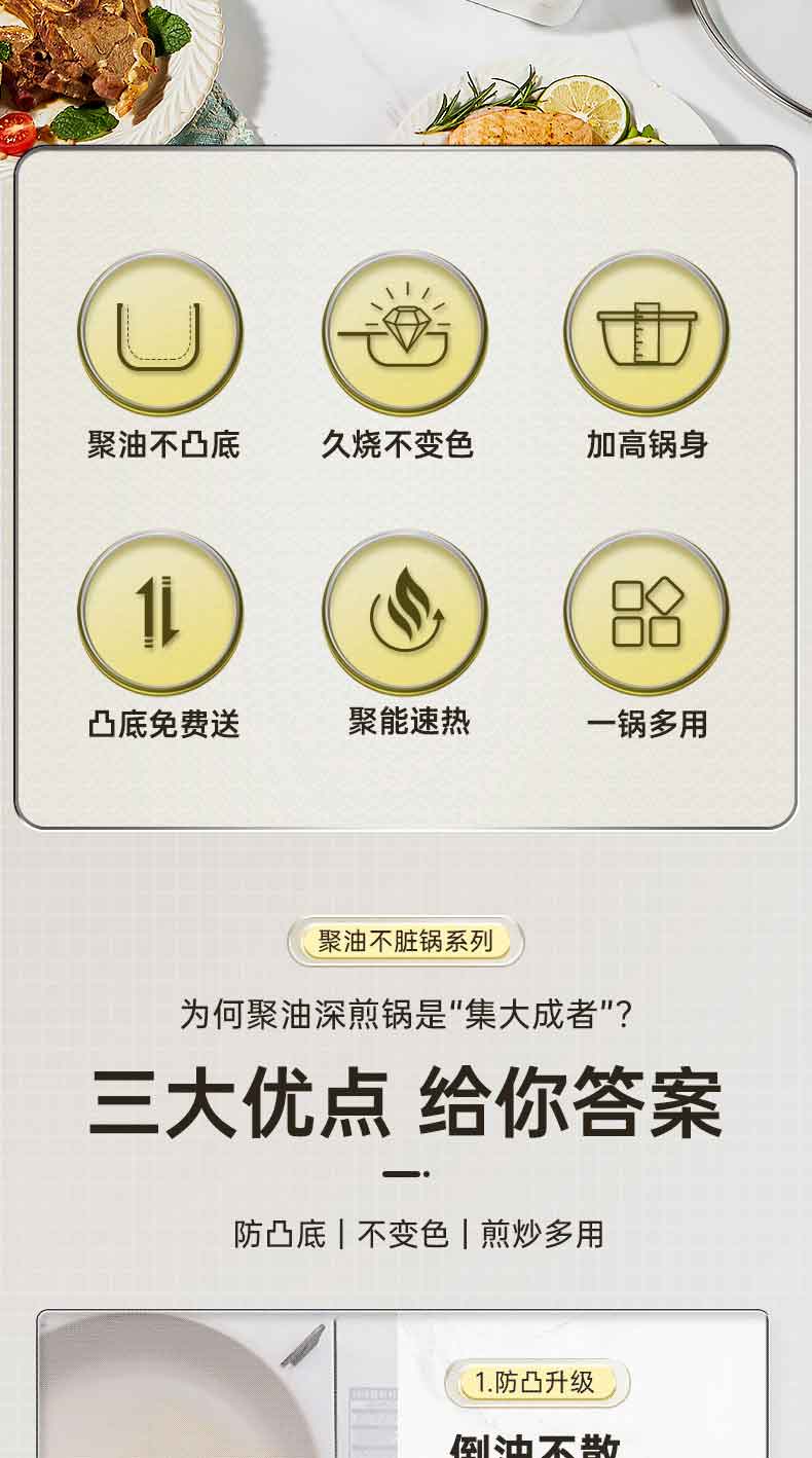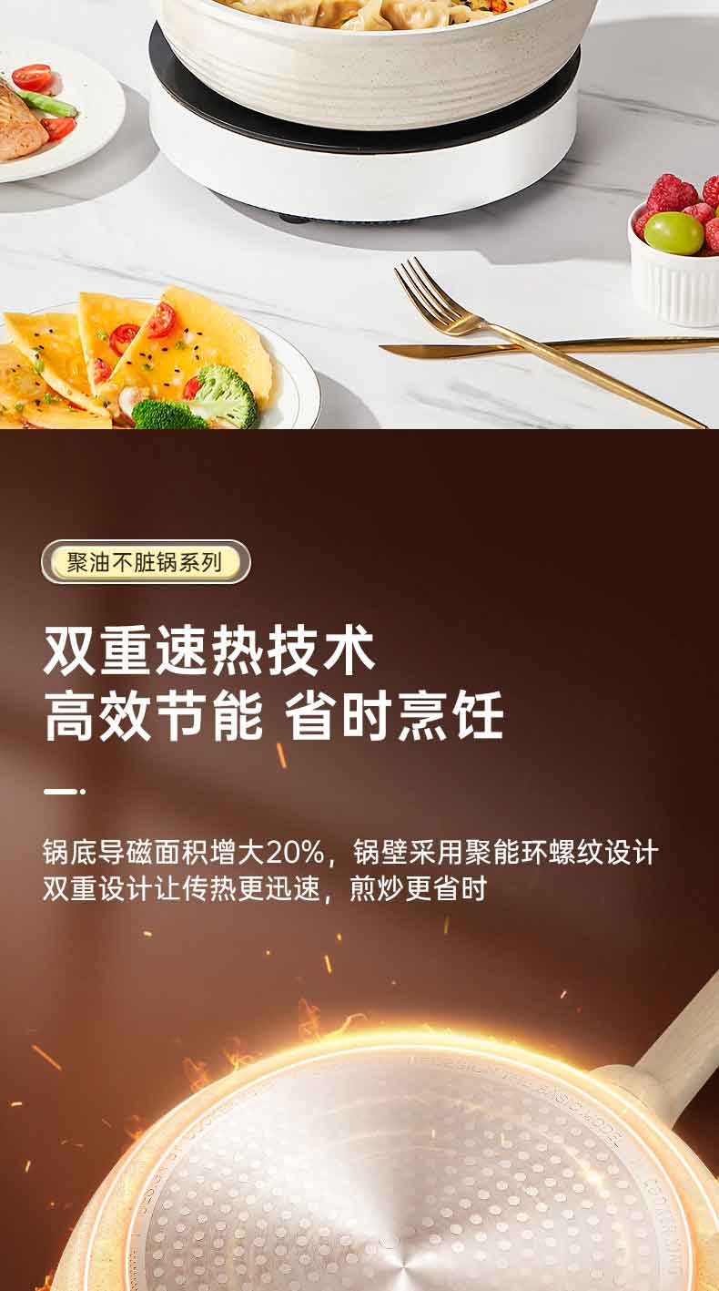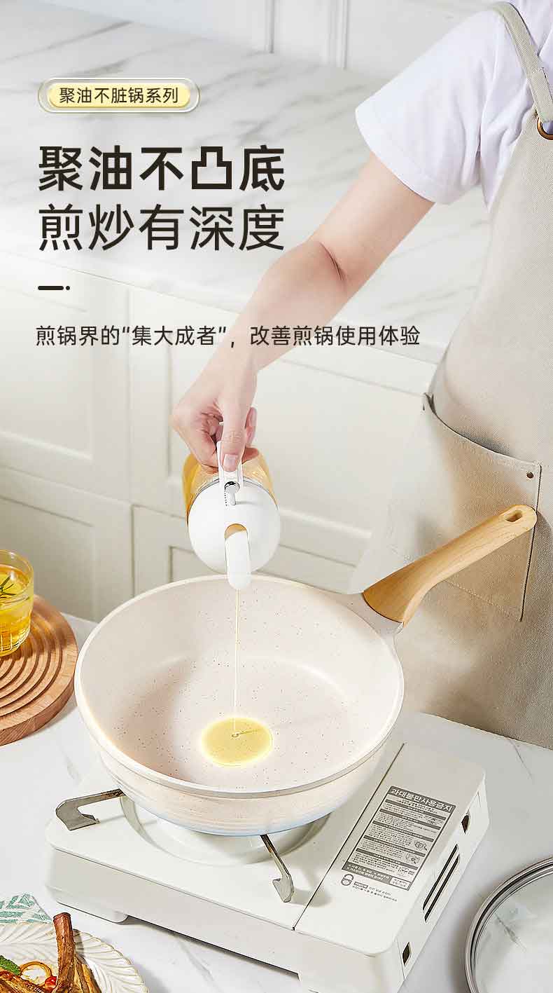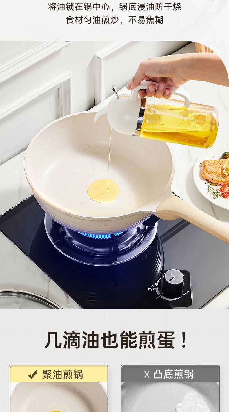 3.优点一 倒油不散,大平底 真聚油,受热不凸防干烧,将油锁在锅中心,锅底浸油防干烧,食材匀油煎炒,不易焦糊。