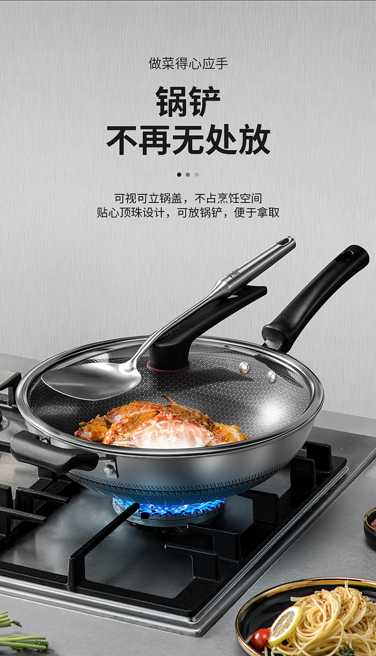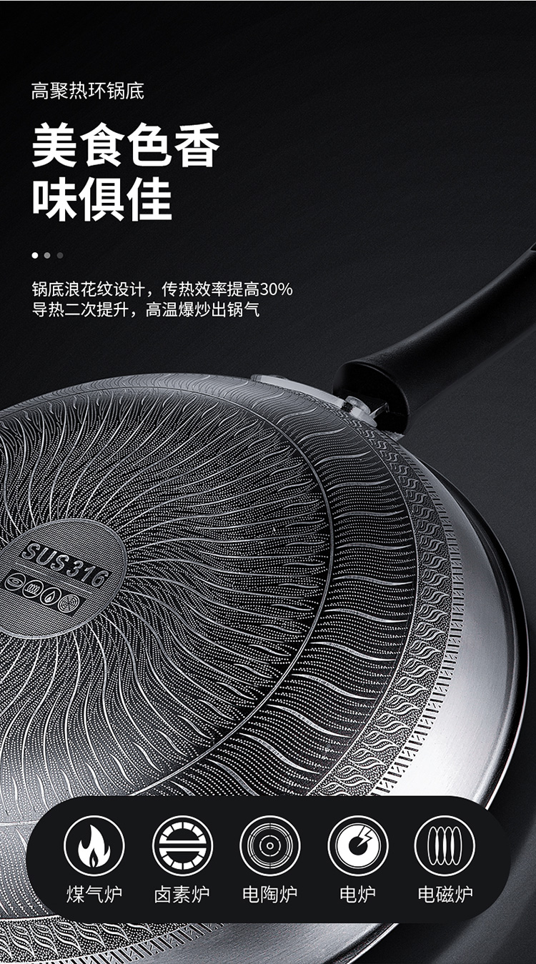 1、美食色香味俱佳锅底浪花纹设计,传热效率提高30%导热二次提升,高温爆炒出锅气