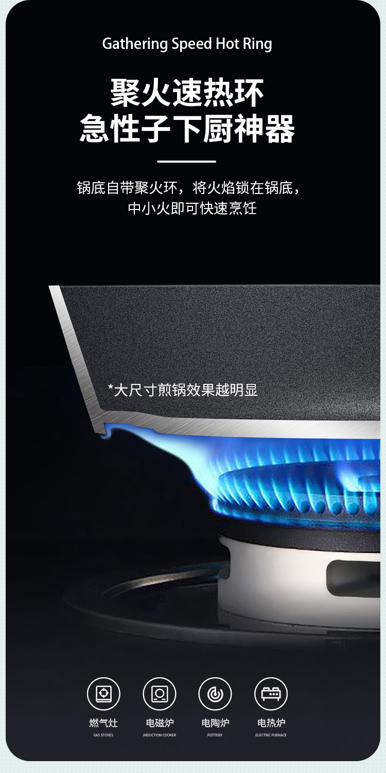 1、专业聚能环、烹饪更省时、减少烹饪时长、锁住食材新鲜味道,厚底薄壁,匀热防焦糊,拒绝呛人油烟。