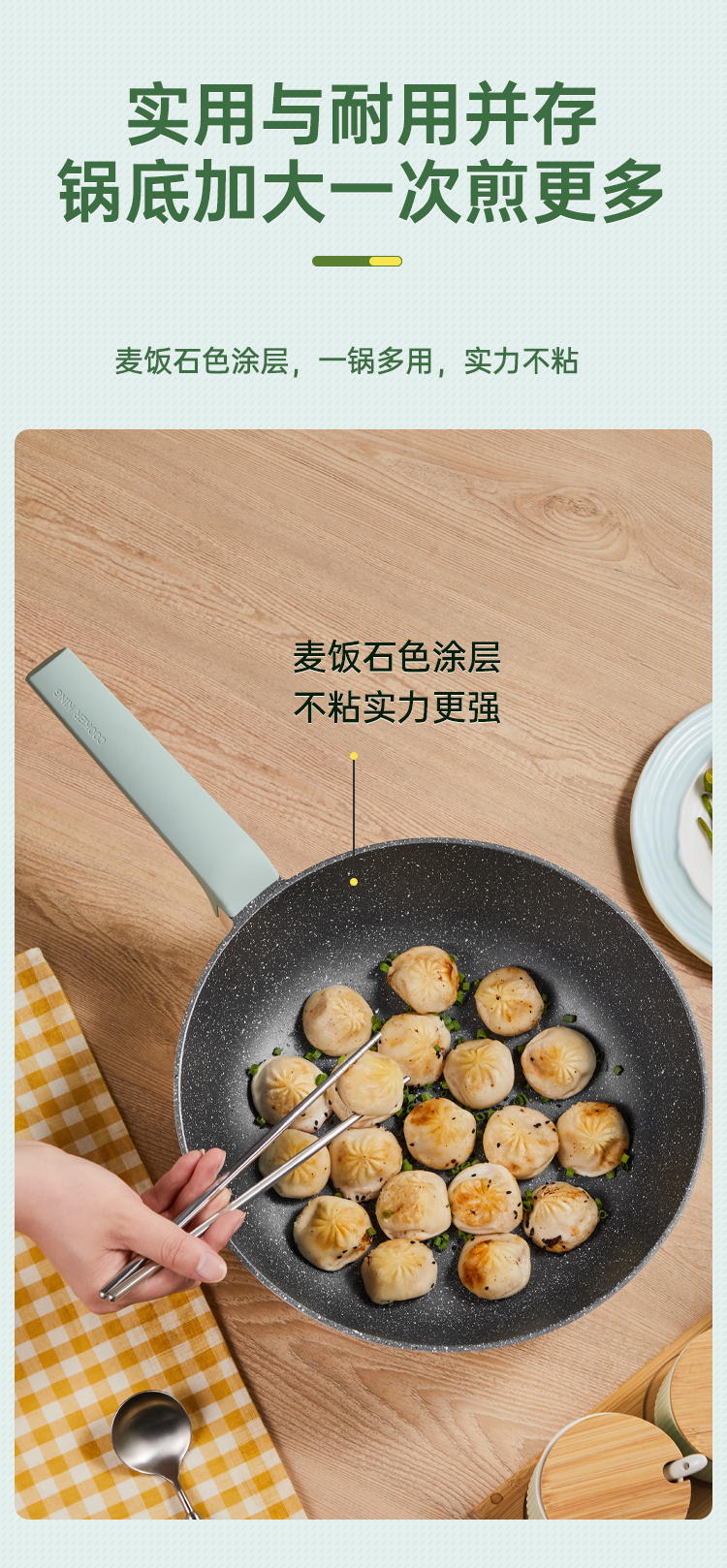 2、麦饭石色涂层,一锅多用,实力不粘,加大锅底,加高锅身,真煎炒减少油烟外溅。