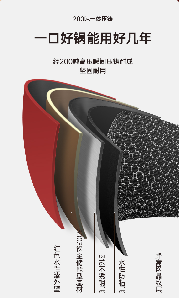 2.口好锅能用好几年.经200吨高压瞬间压铸耐成.坚固耐用