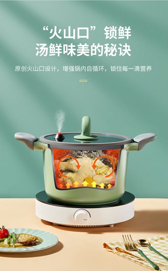 2.硅胶圈锁住水汽,让食材更快熟,汤味更香浓,厚重锅盖保持微压环境,微压省时烹饪靓汤更入味