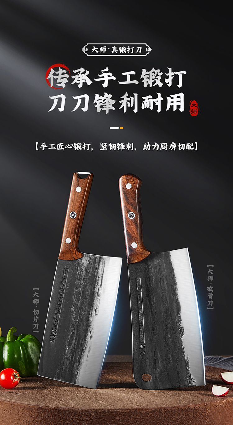1、手工匠心锻打,坚韧锋利,助力厨房切配,锻打后的钢材韧性更好,硬度更佳。