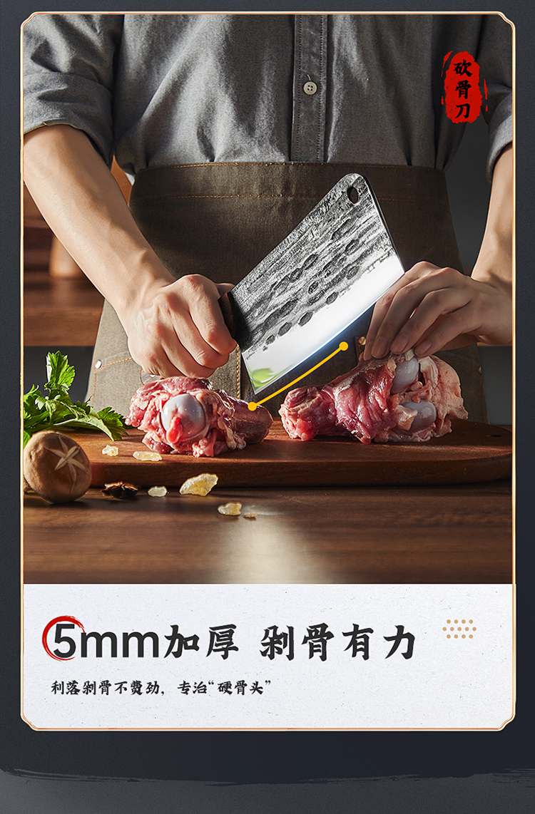 3、锻打锤纹表面,减少与食材接触阻力食材不易粘连,切配更利落,三颗铆钉强力固定,耐用不易脱柄甄选非洲酸枝,握感圆润舒适。