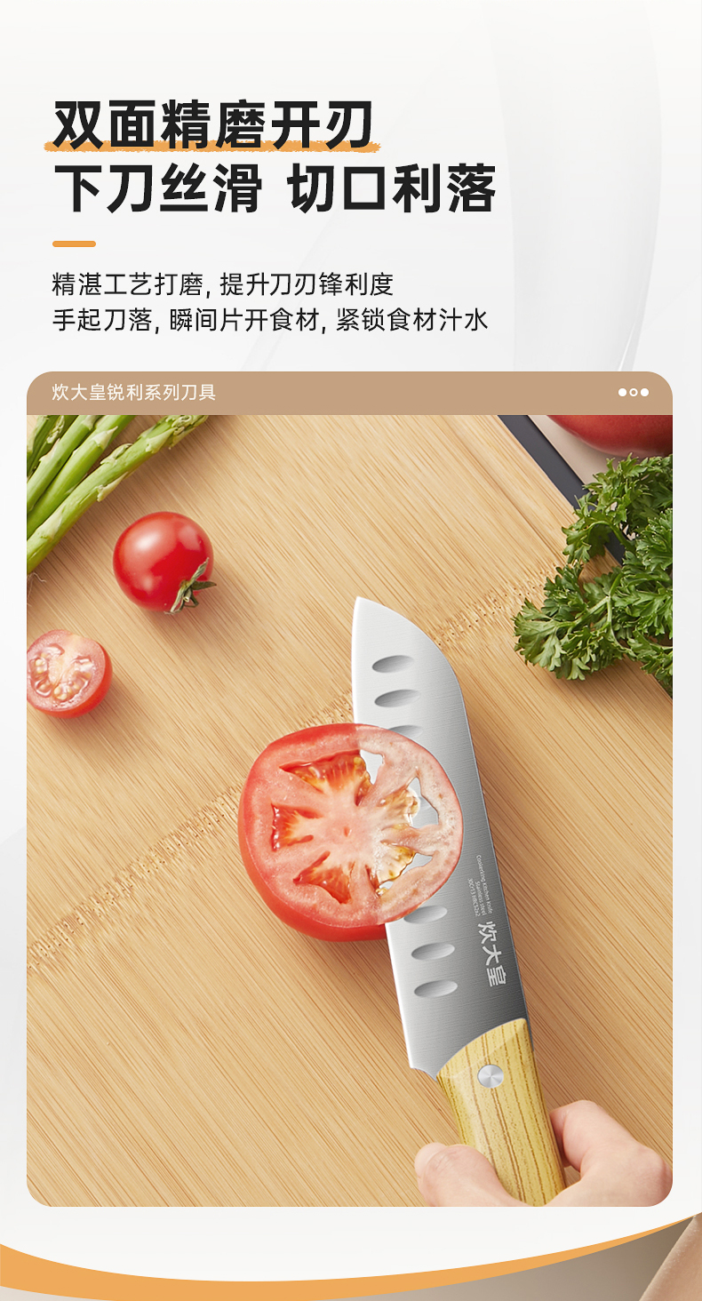 2、精湛工艺打磨,提升刀刃锋利度手起刀落,瞬间片开食材,紧锁食材汁水。