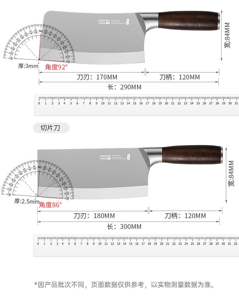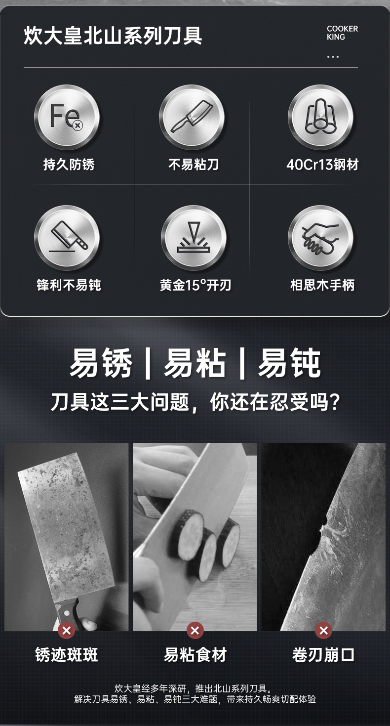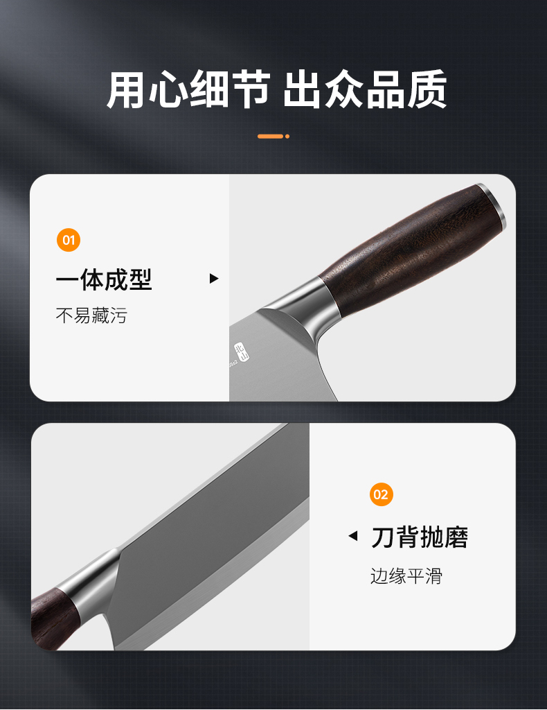 3、锋利不易钝源于40Cr13好钢材,手工湿式水磨开刃,刃口锋利升级让切配比你想象的更畅快。