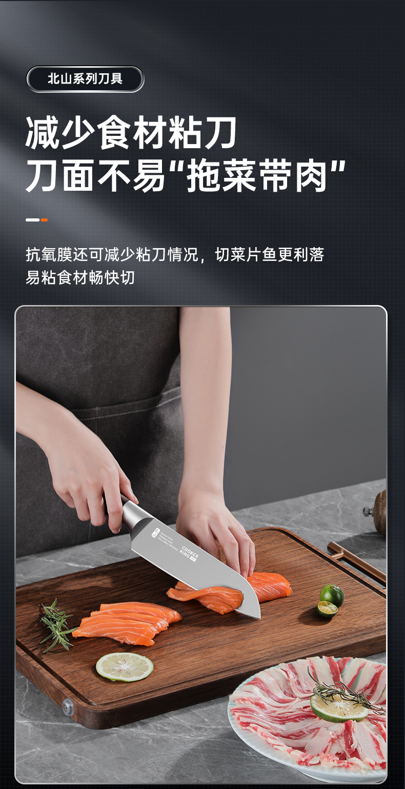 2、48小时实验对比防锈力远胜普通刀具,抗氧膜还可减少粘刀情况,切菜片鱼更利落易粘食材畅快切。