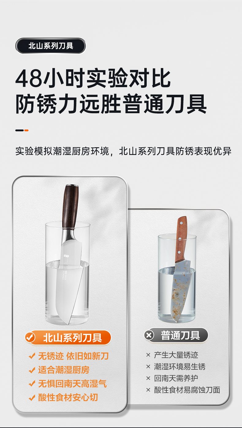 2、48小时实验对比防锈力远胜普通刀具,抗氧膜还可减少粘刀情况,切菜片鱼更利落易粘食材畅快切。