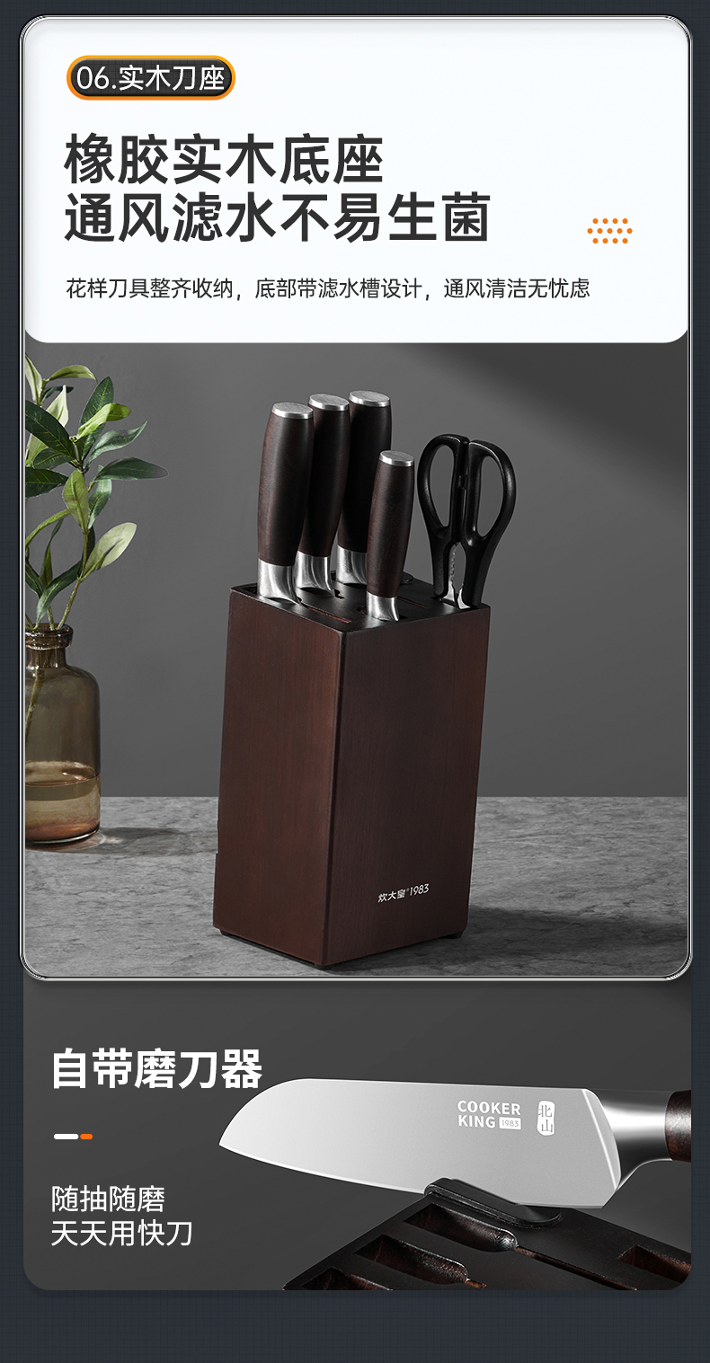 4、橡胶实木底座通风滤水不易生菌,花样刀具整齐收纳,底部带滤水槽设计,通风清洁无忧虑