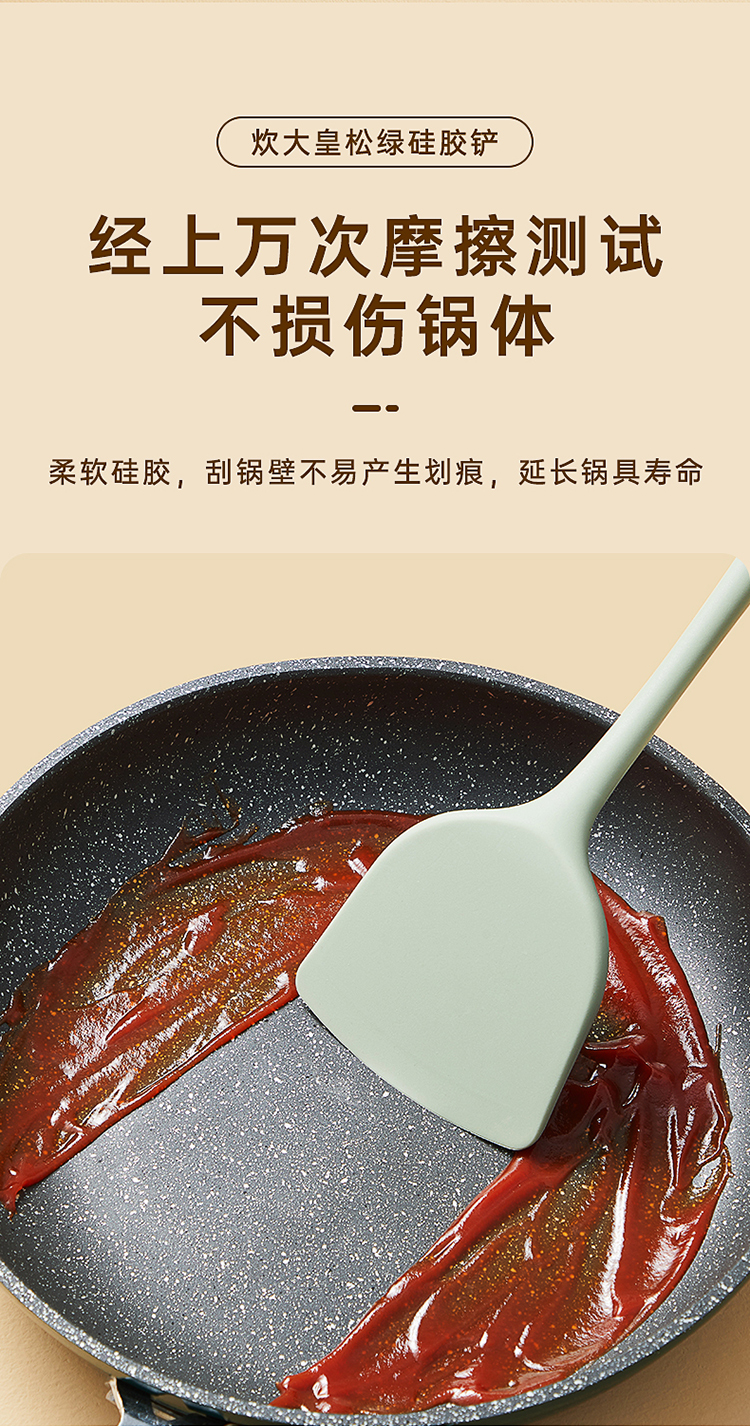 2、经上万次摩擦测试不损伤锅体柔软硅胶,刮锅壁不易产生划痕,延长锅具寿命。