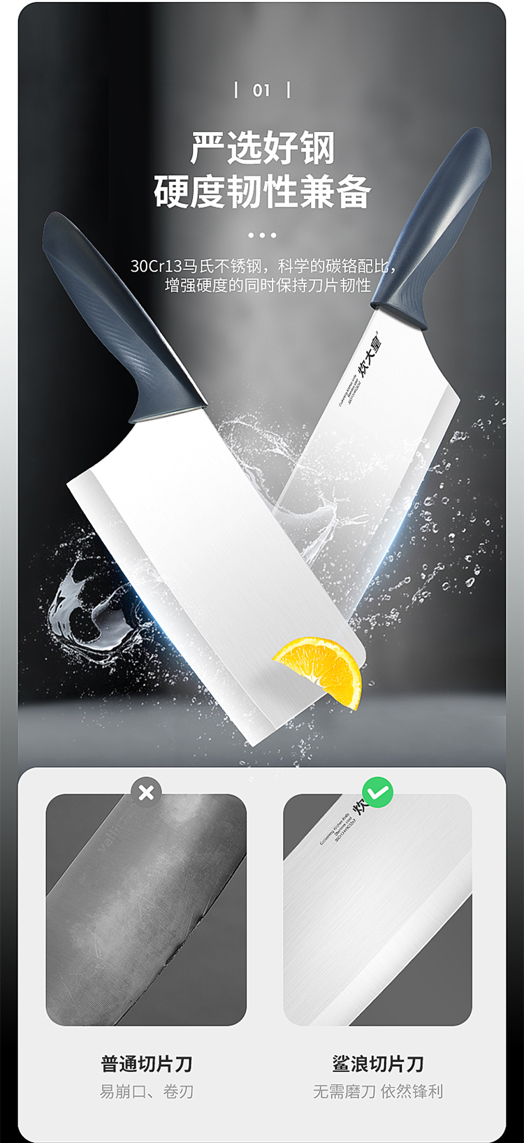 1、口薄背厚加倍锋利切配更省力,抛光刀面多次抛光平滑如镜,一冲即净不粘污渍清洗方便