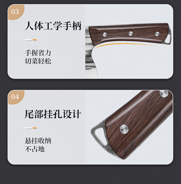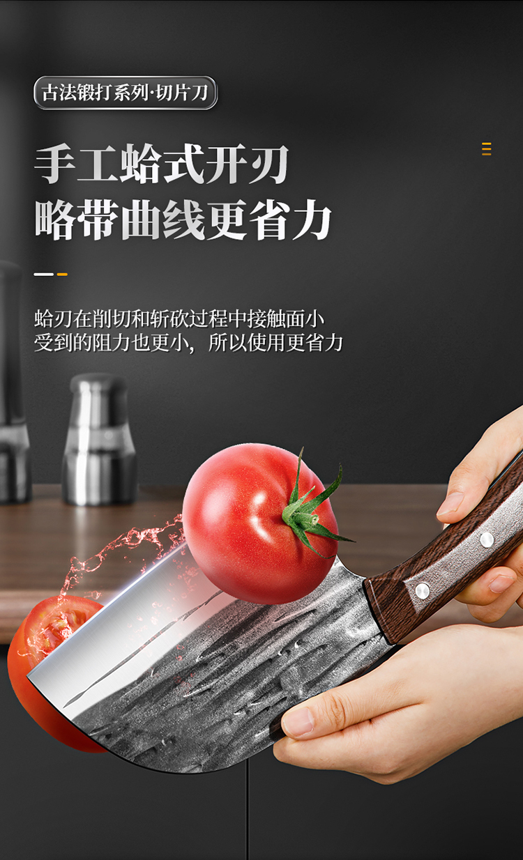 1、古法手工锻打、质地均匀耐磨损、刀刀利落不粘连、历久弥新 坚韧锋利,利刃快刀、切配快速不停顿,轻松掌握厨房切配技巧。