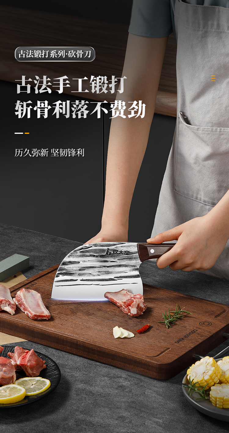 1、古法手工锻打、质地均匀耐磨损、刀刀利落不粘连、历久弥新 坚韧锋利,利刃快刀、切配快速不停顿,轻松掌握厨房切配技巧。