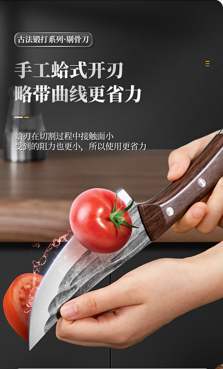 1、古法手工锻打、质地均匀耐磨损、刀刀利落不粘连、历久弥新 坚韧锋利,利刃快刀、切配快速不停顿,轻松掌握厨房切配技巧。