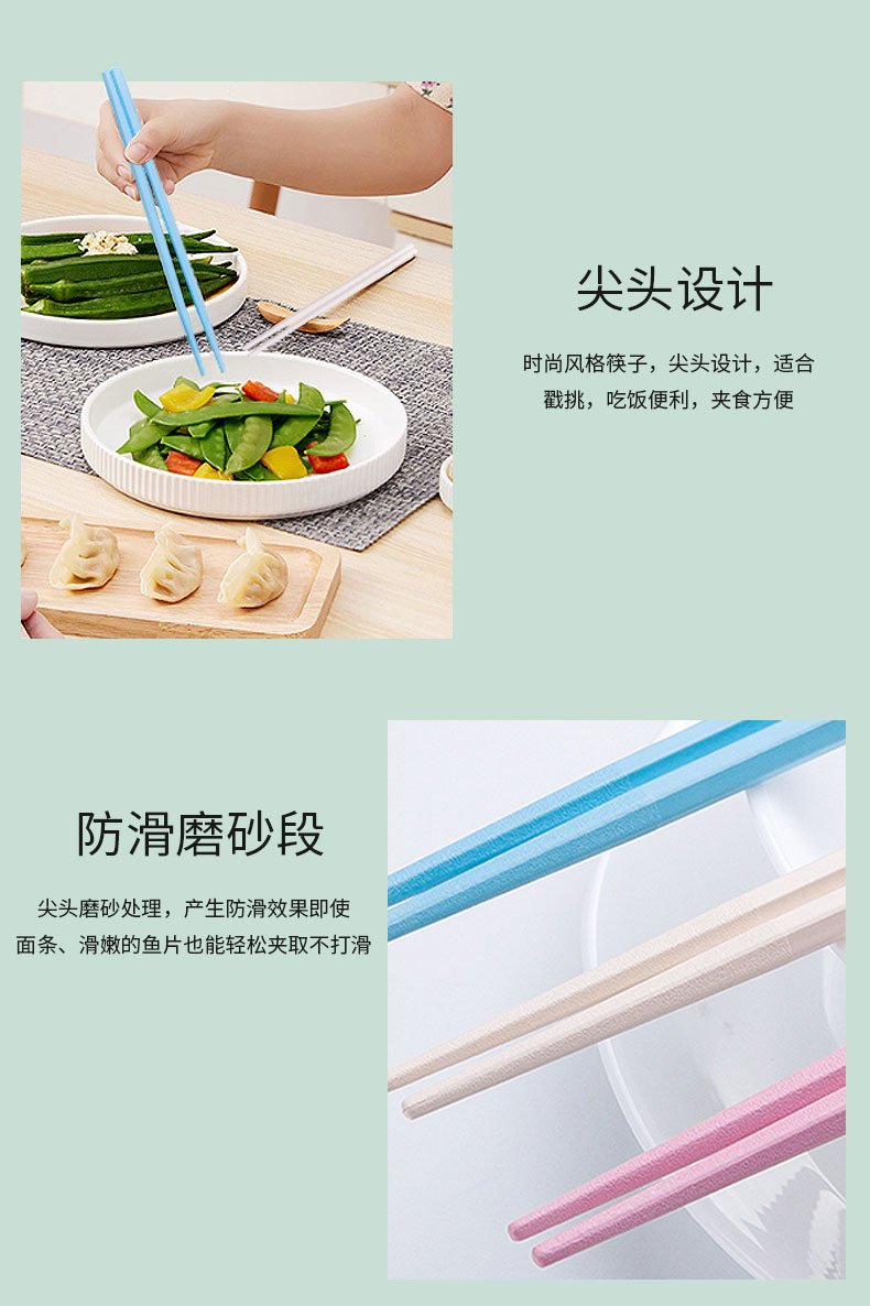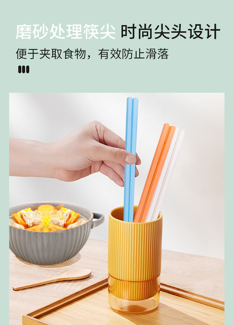 磨砂处理筷尖,时尚尖头设计,便于夹取、戳挑食物,有效防止滑落。