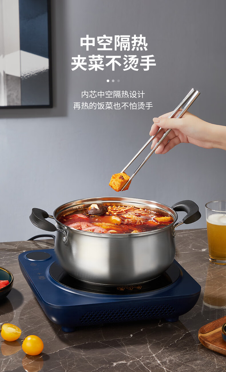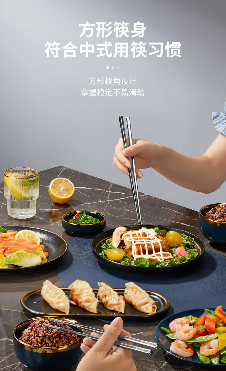 2、无缝筷身不藏污纳垢易于清洗,光亮如镜精美外观彰显品质,凹凸防滑纹理稳稳夹住食材不滑落