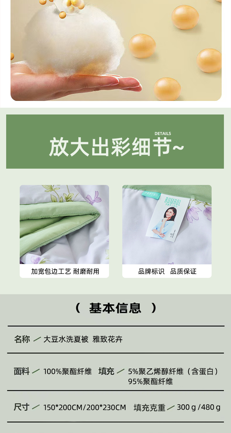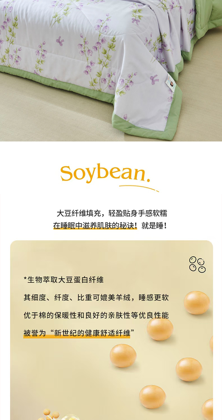 天然环保,亲肤透气:精选大豆蛋白纤维,源自植物萃取,触感如丝绸般柔滑细腻,透气性优于传统棉被,吸湿排汗性能卓越,炎夏不闷汗,空调房不黏腻,敏感肌也能安心使用。