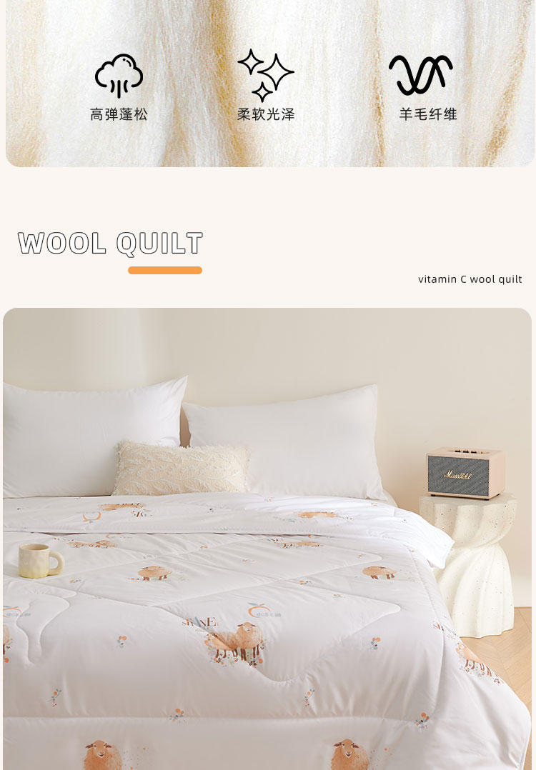 100%羊毛填充,羊毛具有极佳的吸、放湿性,能不断吸收自人体散发的湿气与汗液,并将之排放到空气中,以使被褥保持干爽,舒适。添加了维 C成分的羊毛被,像美白小天使,在你安睡时,默默对抗黑色素让肌肤渐渐白皙,刺激胶原蛋白生成,呵护肌肤,每晚肌肤都在变紧致光滑,同时也是抗氧化卫士,与自由基战斗,守护肌肤。
