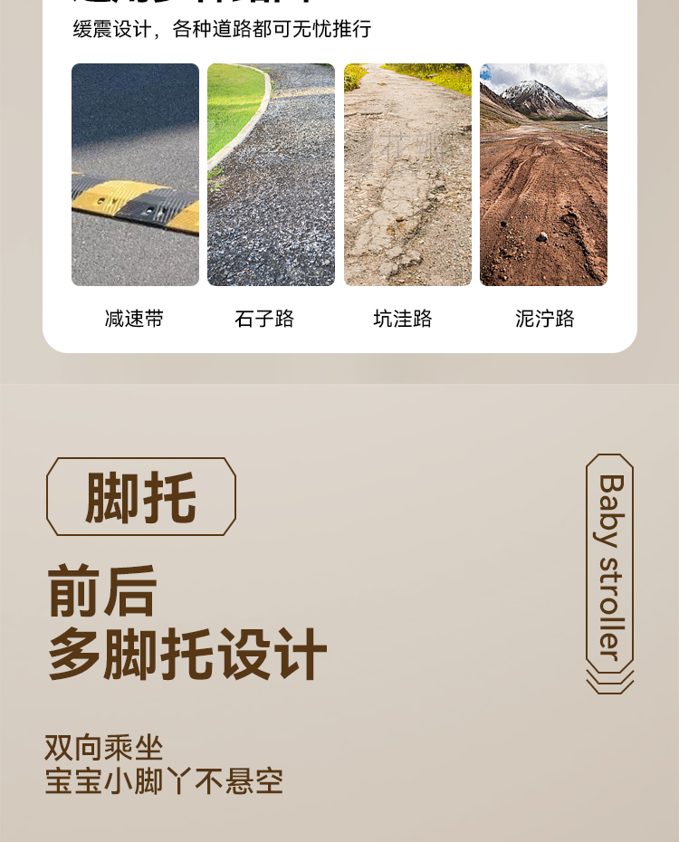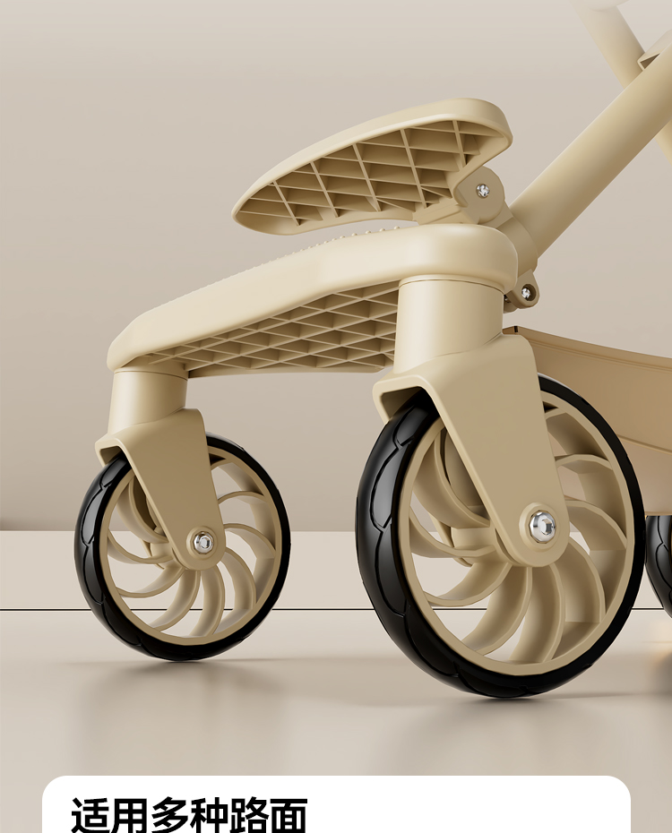 车身采用高碳钢车架,稳固安全;加宽发泡实心轮胎 ,减震防滑,适应各种路况路面;170度三个档位前后可躺宝宝坐累了也能休息一下适应宝宝不同年龄段使用;高景观座椅,骑乘舒适
