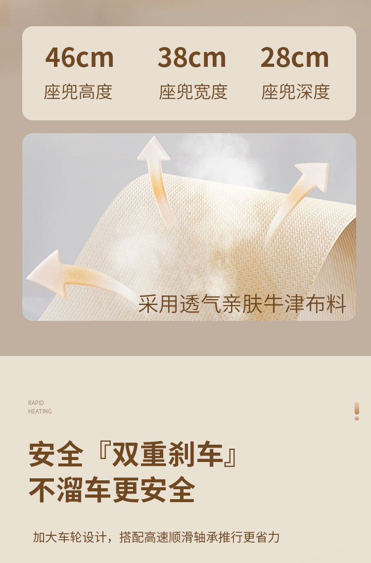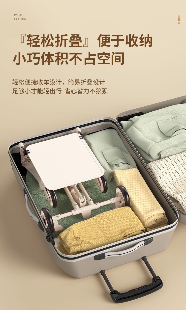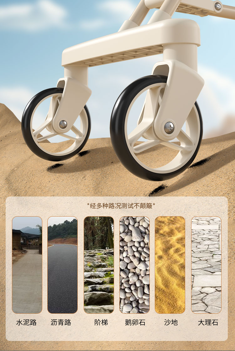 1、加粗加厚碳钢管材,稳固支撑高承重。2、静音EVA轮胎,静音 防滑 耐磨。3、一件折叠设计,外出方便携带,新升级一拉一提即可折叠4,避震万向静音轮推行轻便丝滑,