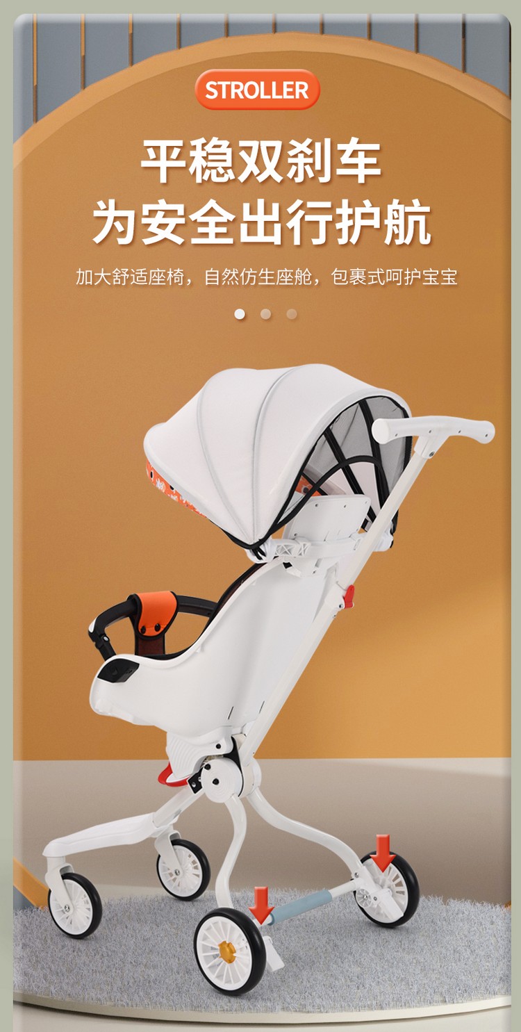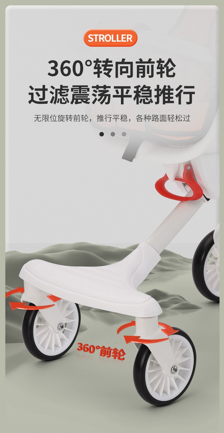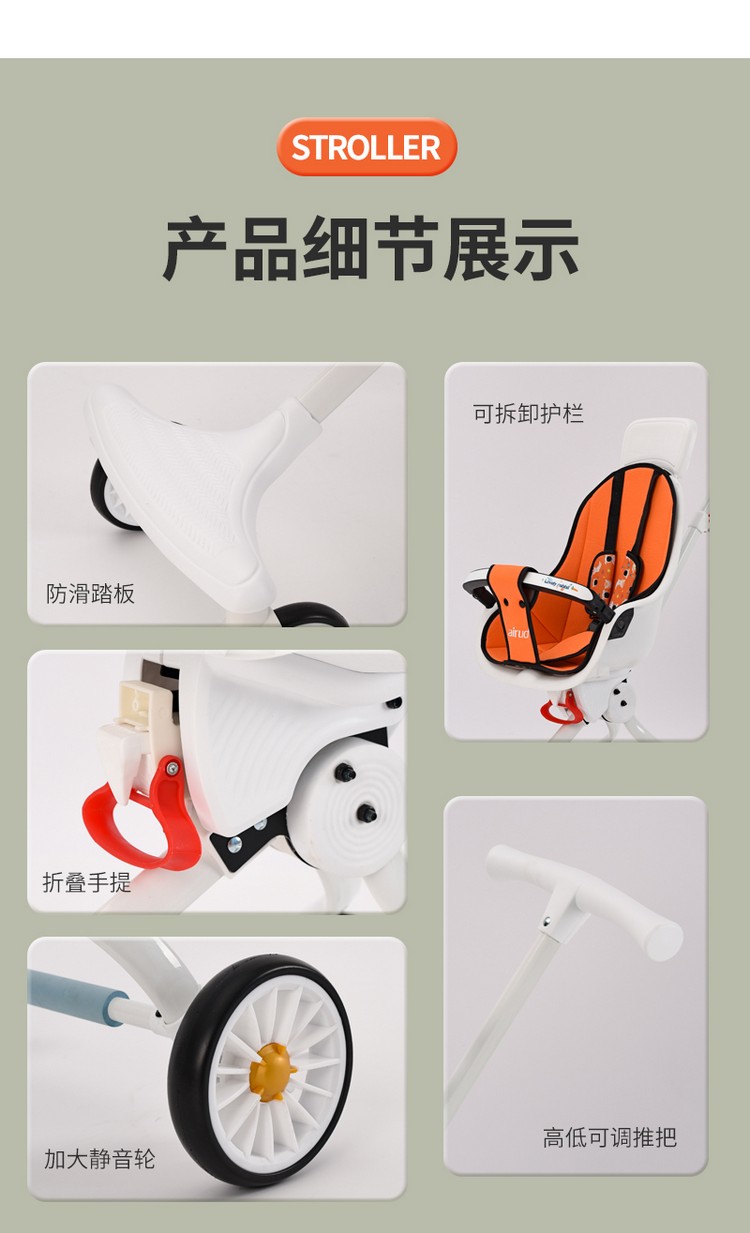 车身采用加粗高碳钢车架,稳固安全;加宽EVA发泡轮发泡实心轮胎 ,减震防滑,包裹式座舱可坐可135º躺宝宝更舒适,轻松变换方向方便实用,磨砂圆润把手,后轮刹车,安全升级