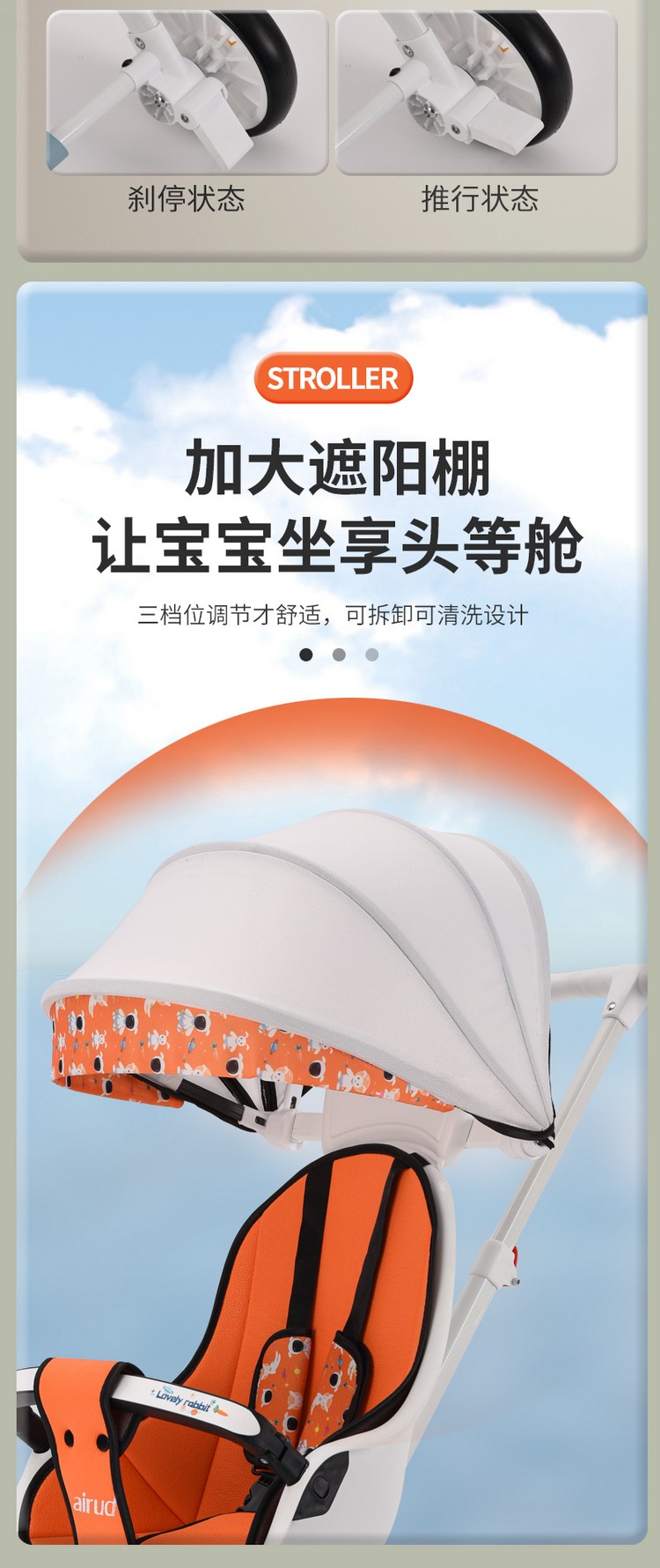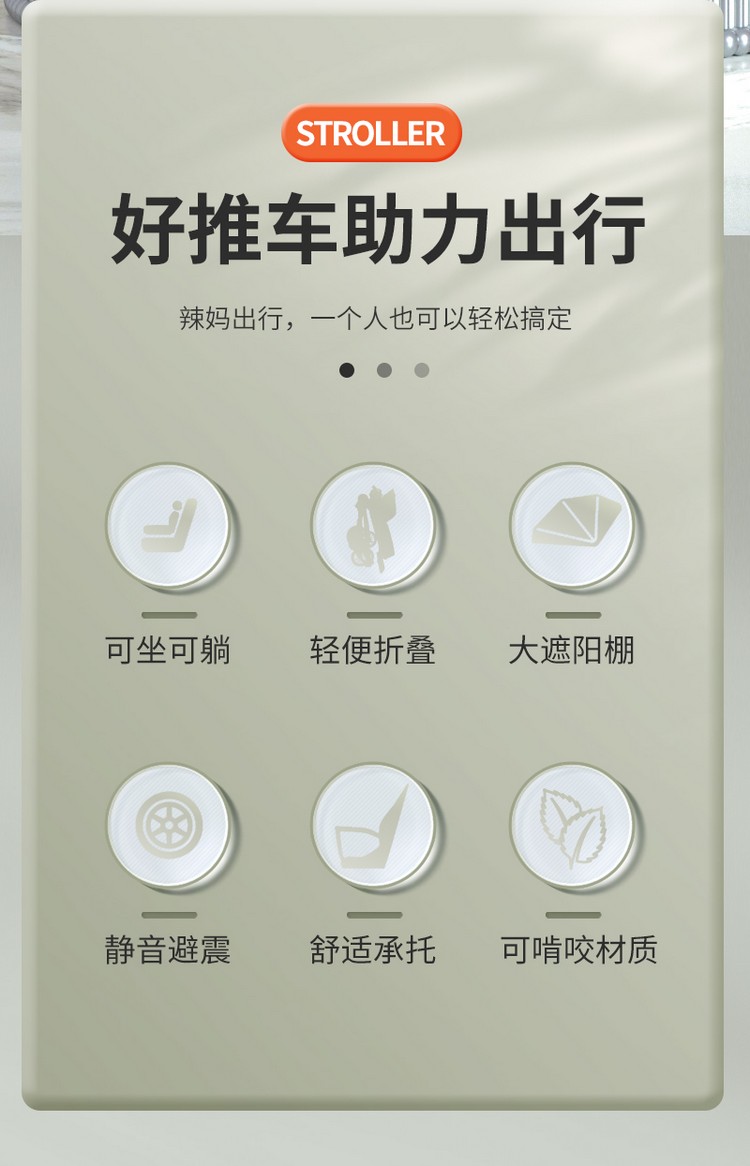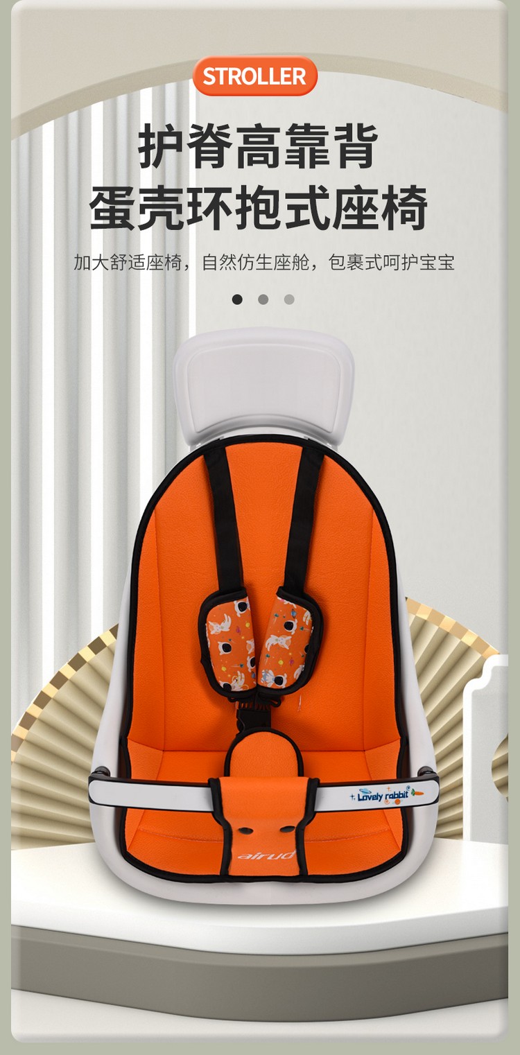 车身采用加粗高碳钢车架,稳固安全;加宽EVA发泡轮发泡实心轮胎 ,减震防滑,包裹式座舱可坐可135º躺宝宝更舒适,轻松变换方向方便实用,磨砂圆润把手,后轮刹车,安全升级