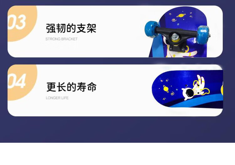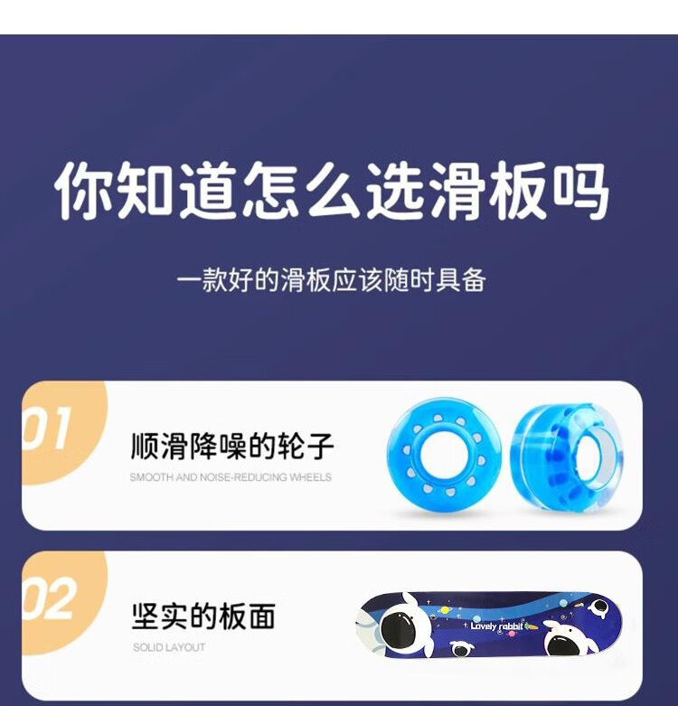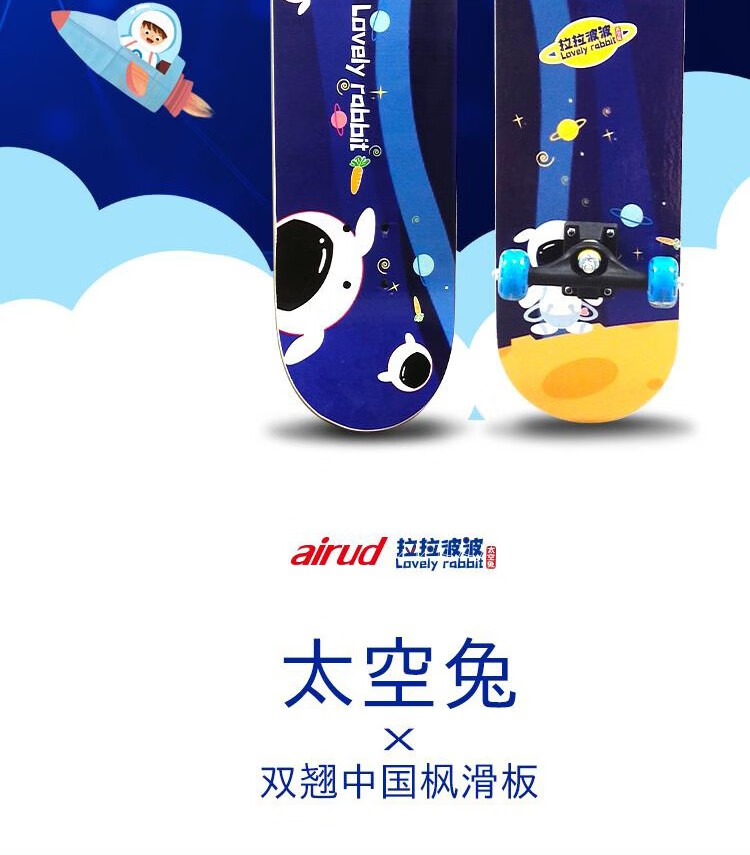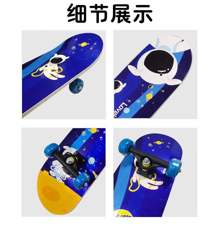 双翘滑板可练习空中翻转跳跃等动作、易操作,配有七层中国枫木板材紧固、安全并且使用寿命更长。闪光PU静音轮硬度高直径小,起跳落地回弹更稳。