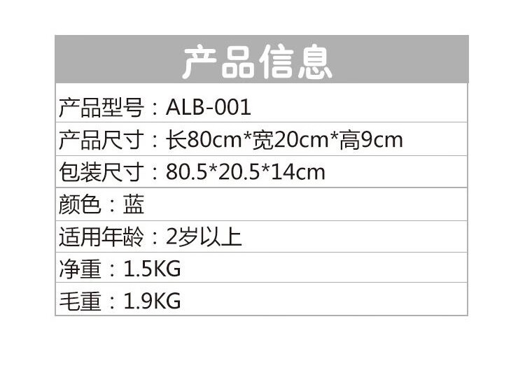 包装尺寸:80.5*20.5*14cm 商品规格: 80*20*9cm 商品净重:1.5kg 毛重:1.9kg 适合年龄:2岁以上 承重:100公斤