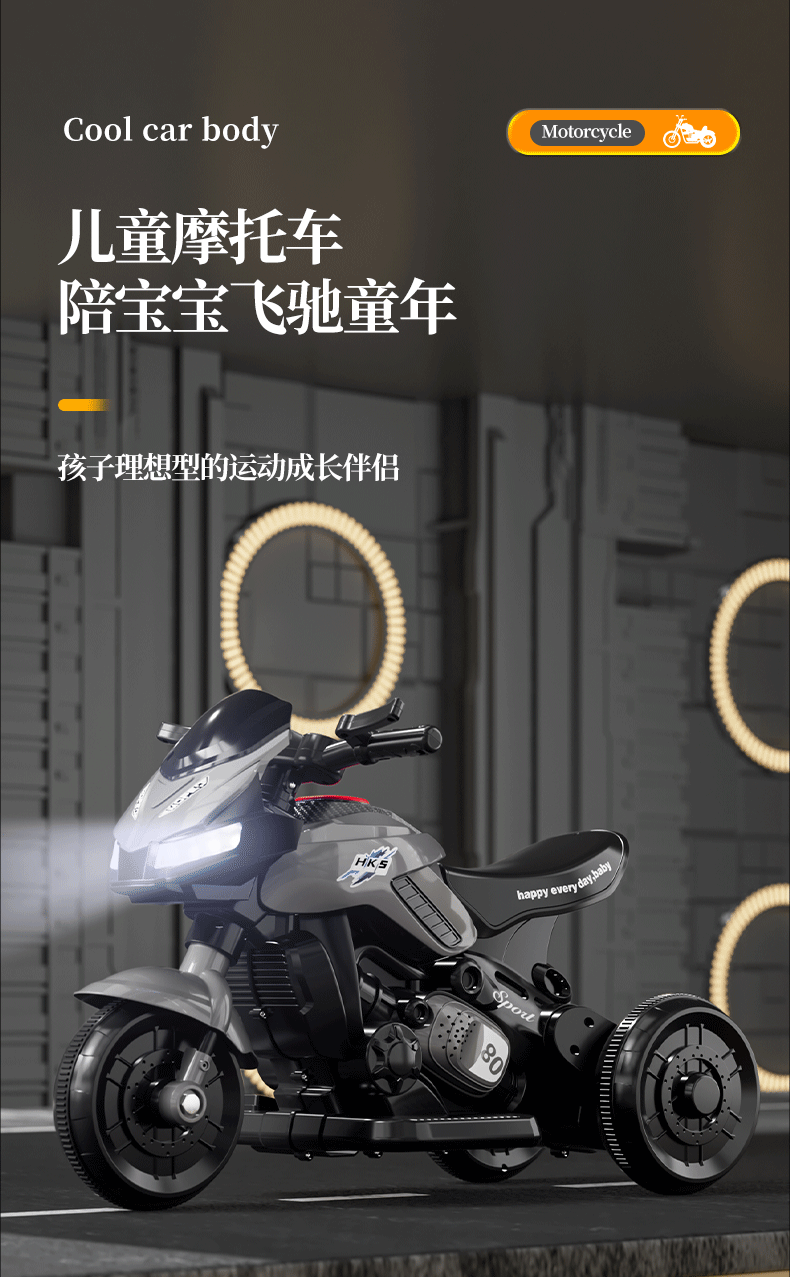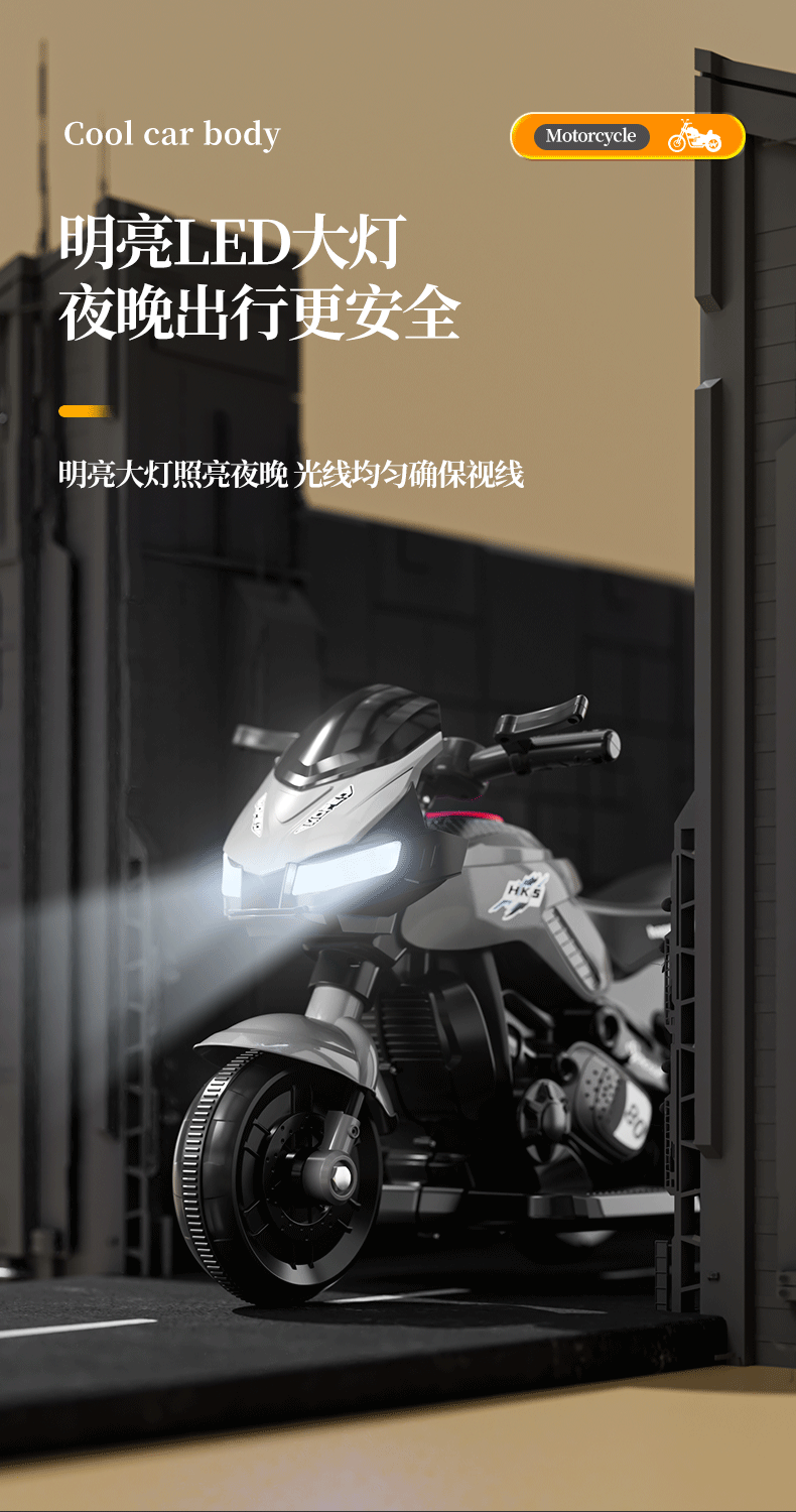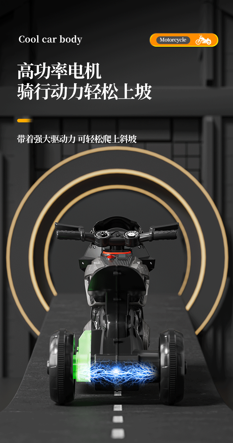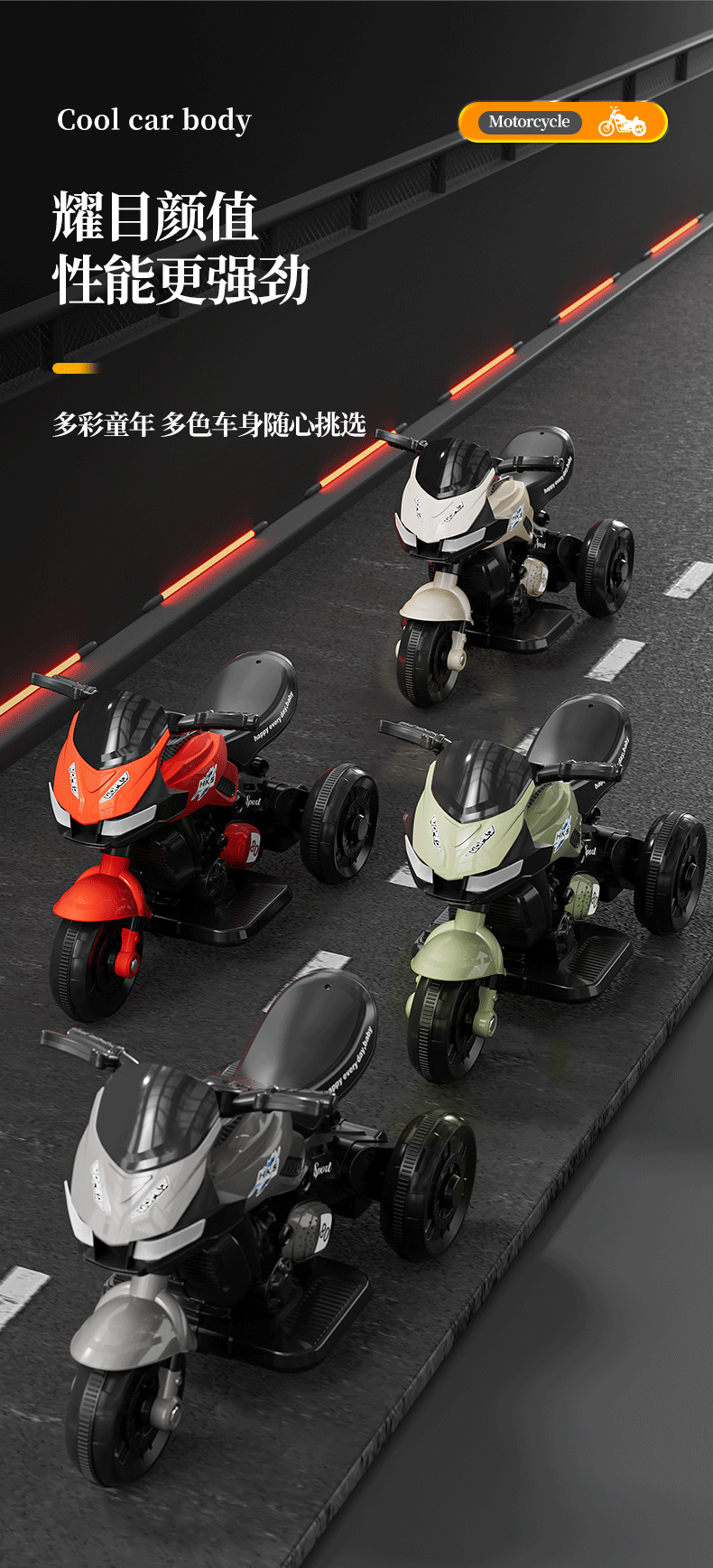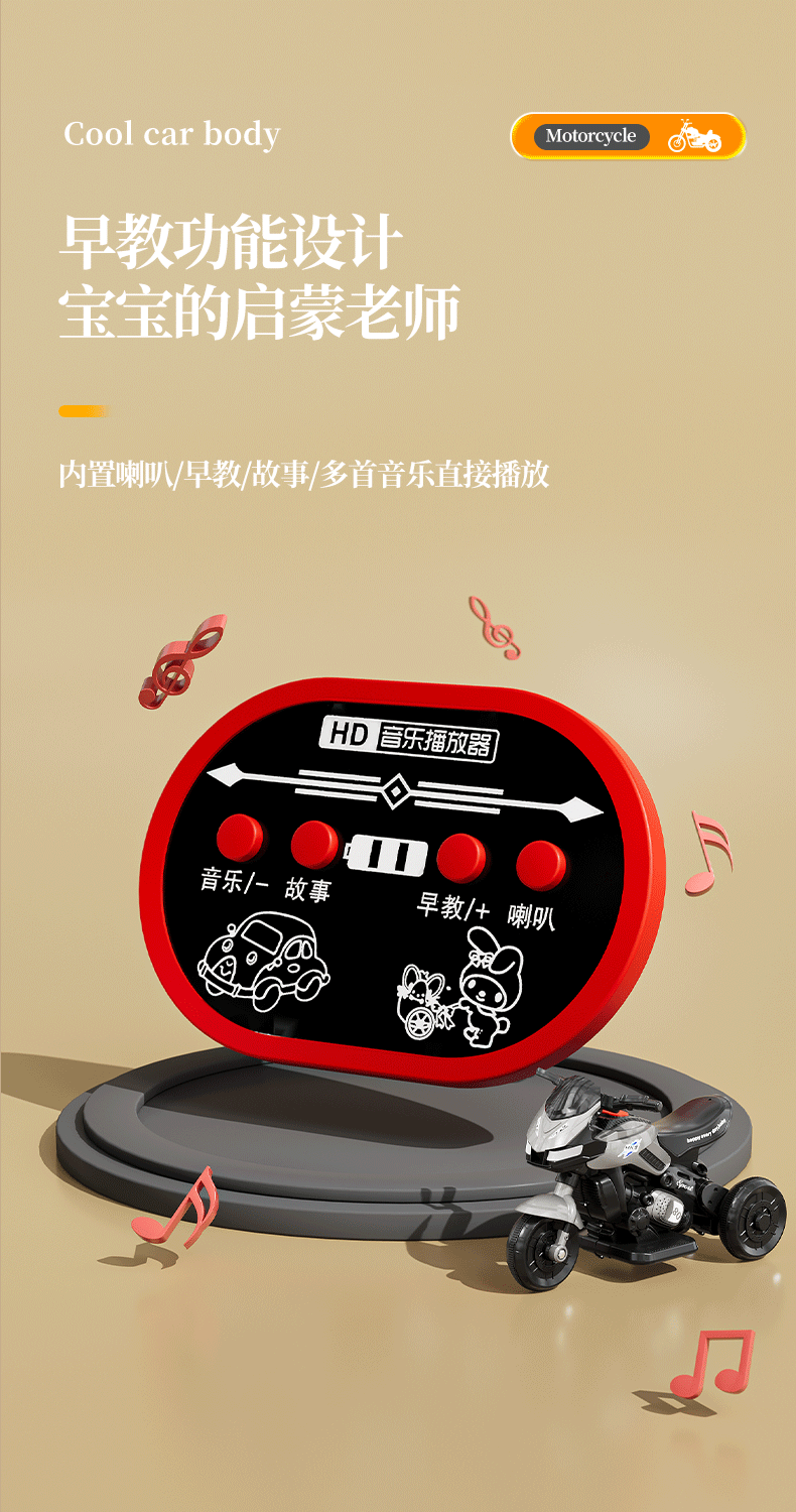 功能:益智早教功能,音乐,唐诗,故事。LEd仿真灯光,炫酷拉风,小身体大乐趣。电量显示,音量可调节,6.4v电瓶,单驱380驱动,适合1-5岁儿童,速度与激情的碰撞,体验感超强