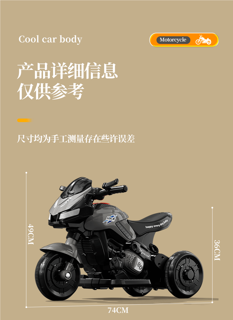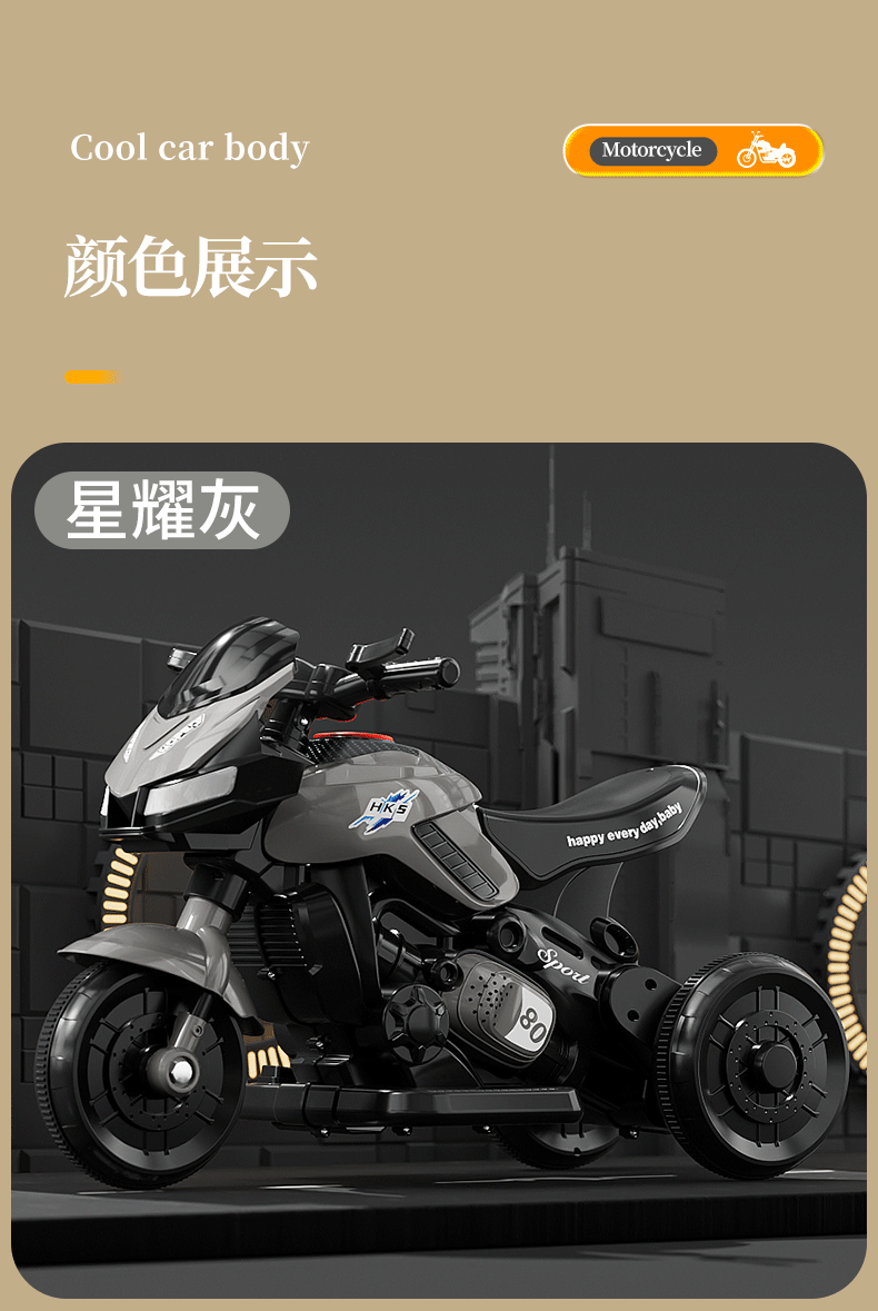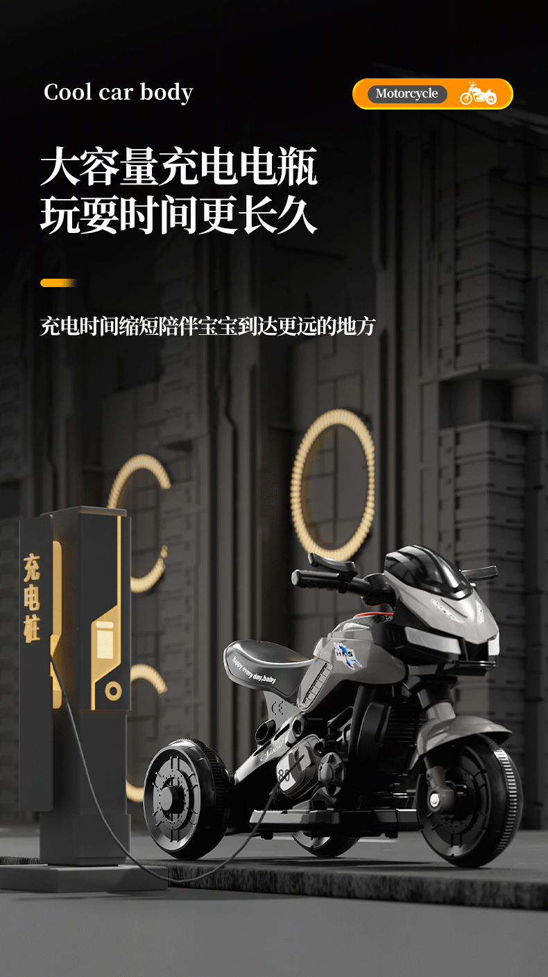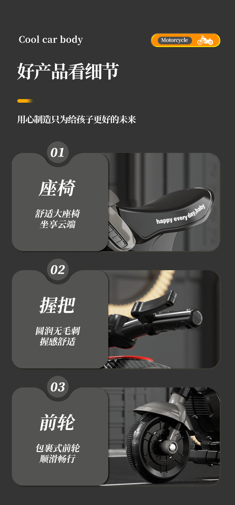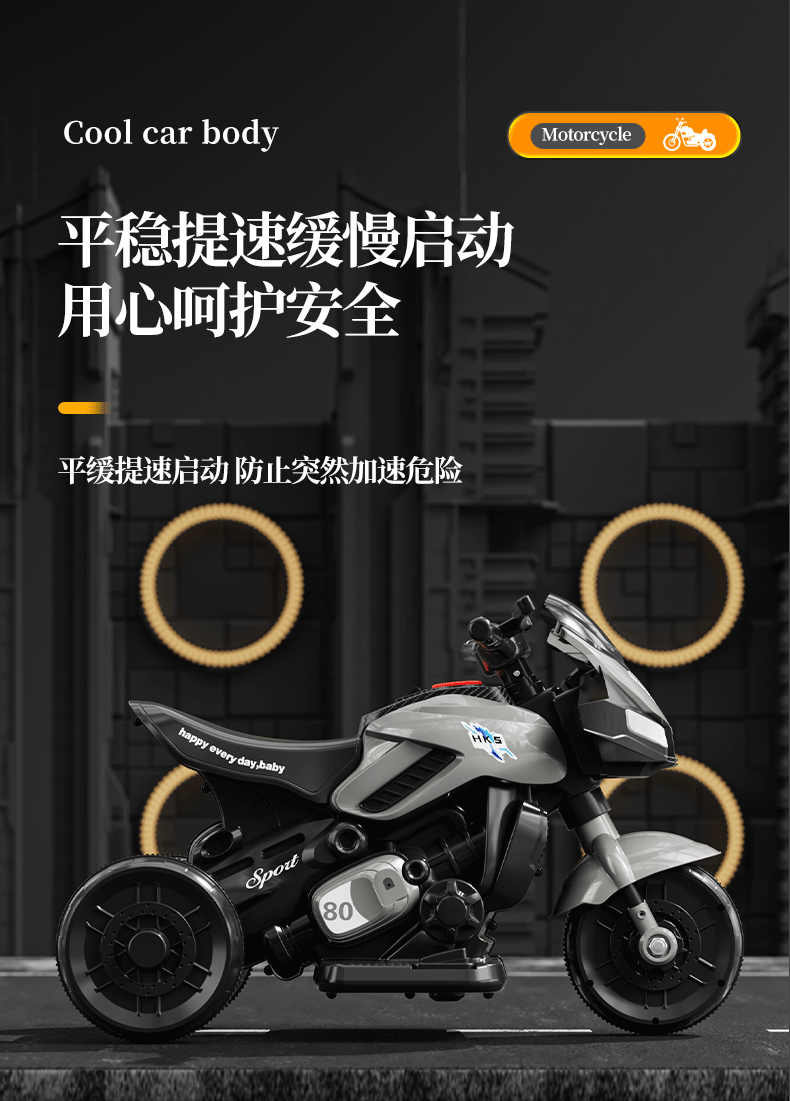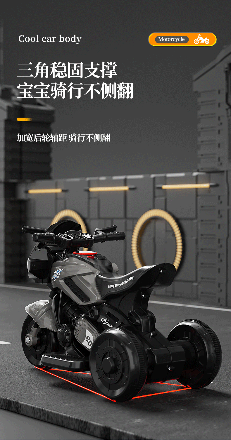 功能:益智早教功能,音乐,唐诗,故事。LEd仿真灯光,炫酷拉风,小身体大乐趣。电量显示,音量可调节,6.4v电瓶,单驱380驱动,适合1-5岁儿童,速度与激情的碰撞,体验感超强